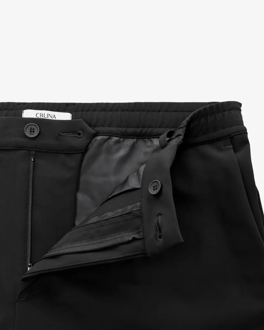 Mitte Joggpants für Herren von Cruna in Schwarz. Das verkürzte Modell bestichtdurch die elastische Tech-Qualität mit innenliegendem Tunnelzug als idealer HighPerformance-Begleiter, welcher durch die Bundfalten einen stilvollen Touch imAnzughosen-Stil erhält.