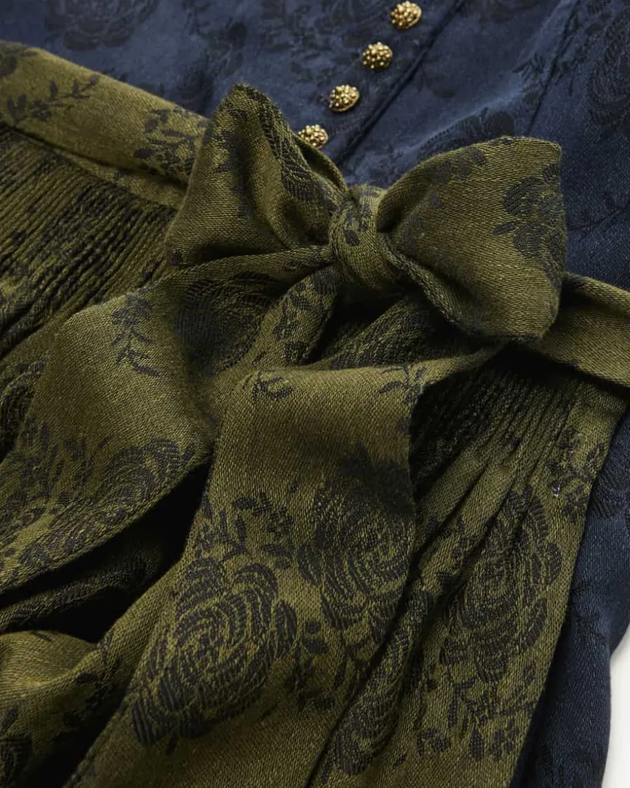 Monika Dirndl lang mit Schürze für Damen von Gottseidank in Navy und Oliv. Dankdes floralen Musters erhält der Artikel einen traditionell-femininen Charme,während klassische Details den letzten Schliff verleihen. Die schlichte Schürzerundet das Gesamtbild harmonisch ab.