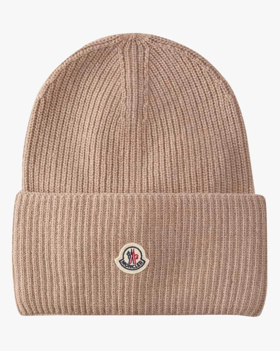 Mütze für Damen von Moncler in Sand. Das Modell punktet dank der Schurwoll-Verarbeitung in Rippstrick-Qualität mit einem besonders weichen Griff, währenddas schlichte Design mit Logo-Applikation ein vielseitiges Accessoire kreiert.