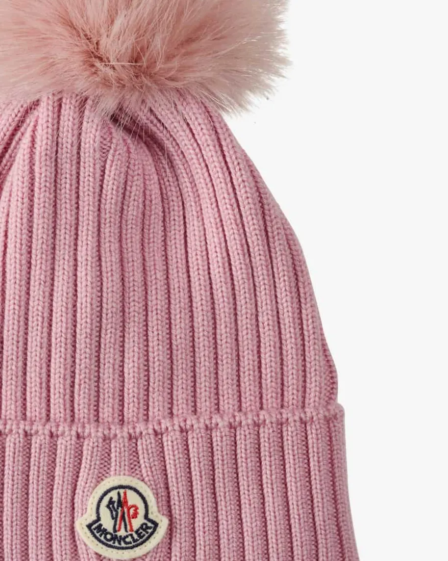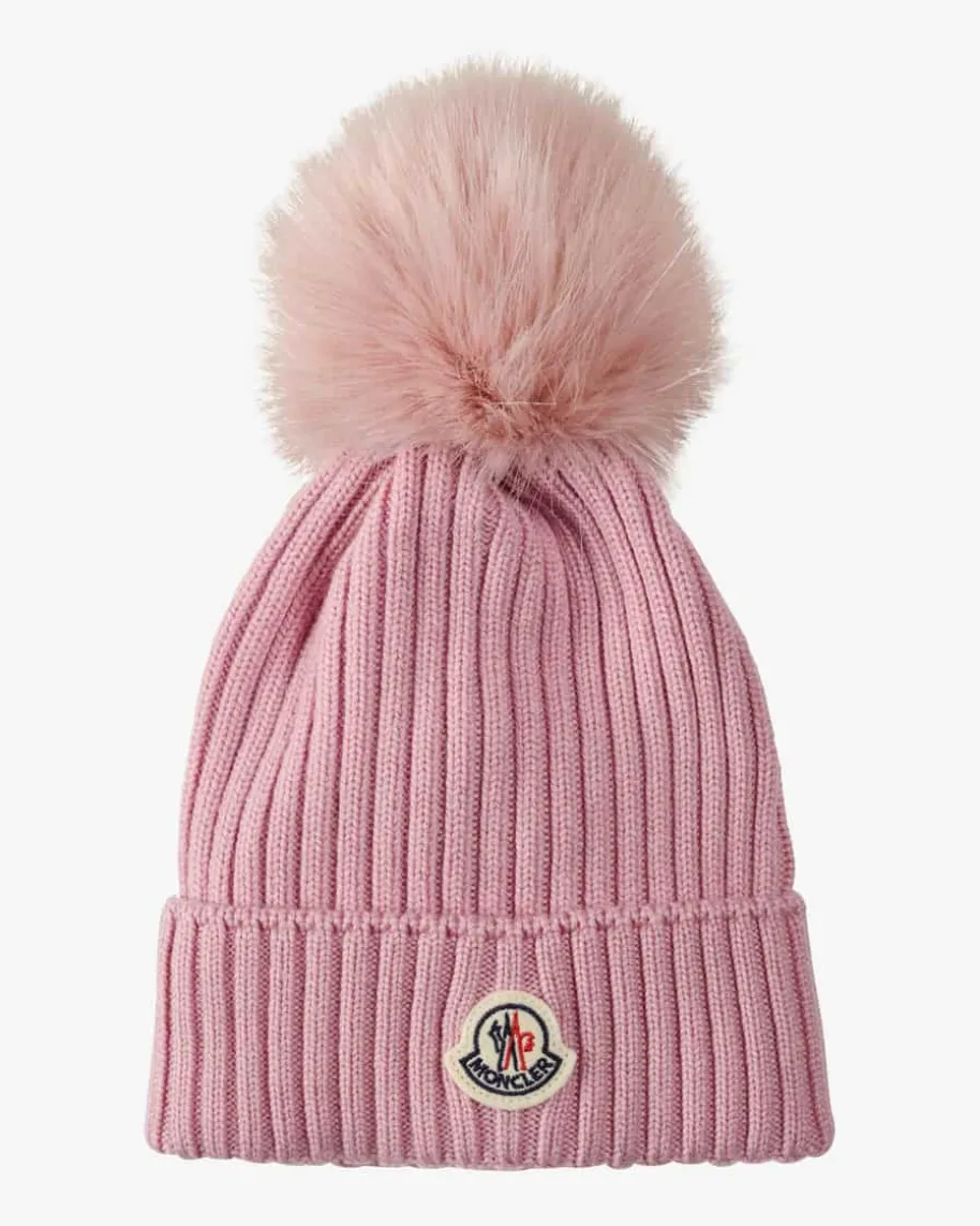 Mütze für Mädchen von Moncler Enfant in Rosa. Das Modell aus angenehmerSchurwoll-Qualität avanciert durch sein zeitloses Design in Rippstrick-Aufmachung zum perfekten Begleiter. Der tonale Kunstfell-Bommel sowie dielabeltypische Logo-Applikation setzen zudem modische Akzente.