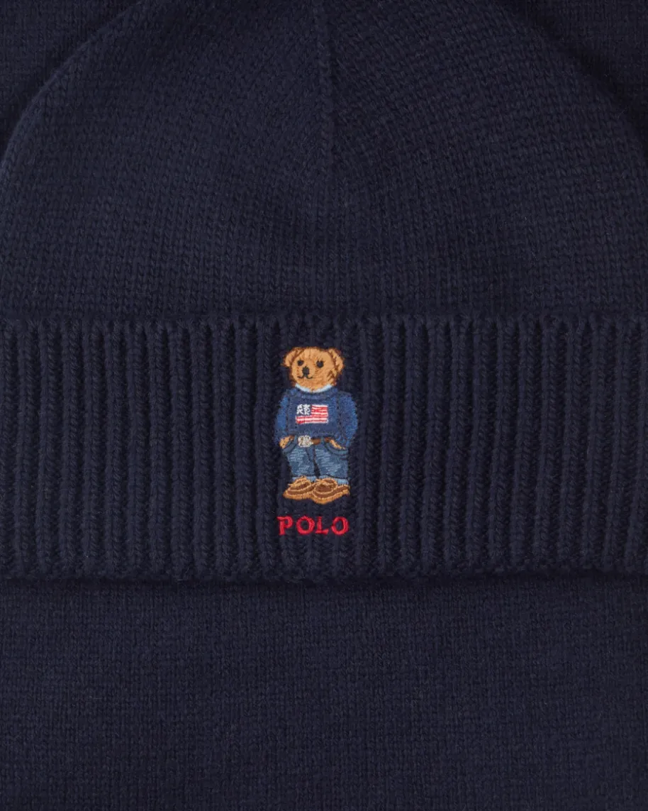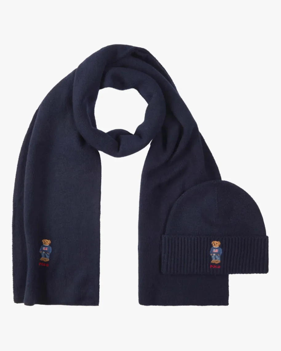 Mützen-Schal-Set für Herren von Polo Ralph Lauren in Navy. Diese Modelle ausangenehmem Woll-Mix überzeugen dank schlichtem Design in Kombination mit dercharmanten Polobär-Stickerei als moderne Begleiter für kühle Tage.