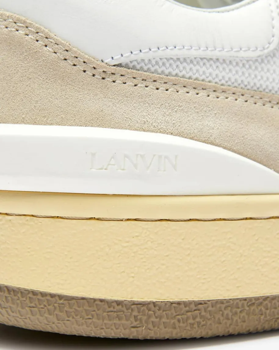 Nash Sneaker für Herren von Lanvin in Weiß und Beige. Dieses Modell präsentiertsich mit raffiniertem Material-Mix aus Glatt-, Veloursleder sowie Mesh undavanciert dank goldfarbenen Logo-Details zum sportiven Must-Have.