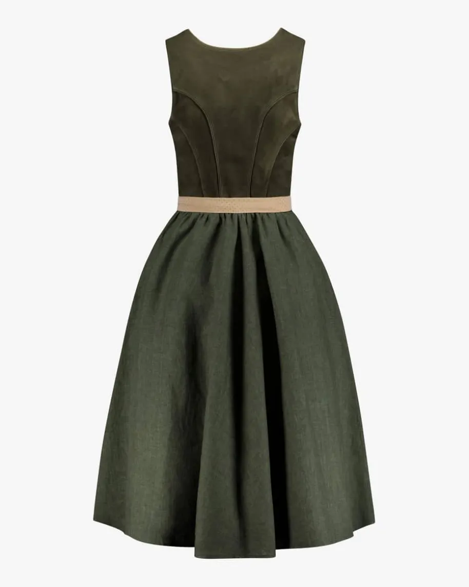 Nassfeld Midi-Dirndl mit Schürze für Damen von Meindl in Dusty Green. DiesesModell spiegelt die hochwertige Lederhandwerkskunst von Meindl gekonnt wider.Das Mieder besticht durch die Verwendung des weichen Velours und wird durchtonale Paspelierungen stilvoll ergänzt. Zugleich setzt der Rock aus zeitloserLeinen-Qualität das traditionelle Design perfekt in Szene, während diechangierende Schürze mit dezentem Allover-Dessin das Gesamtbild harmonischkomplettiert.