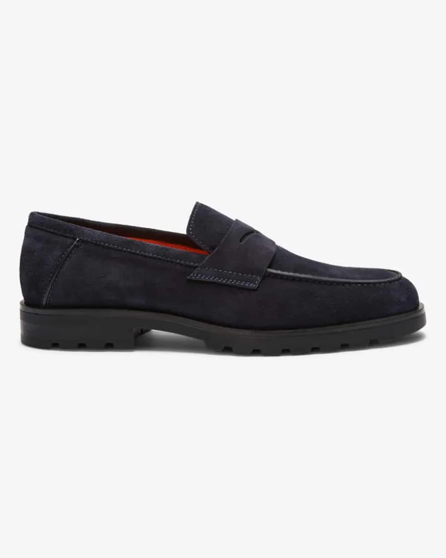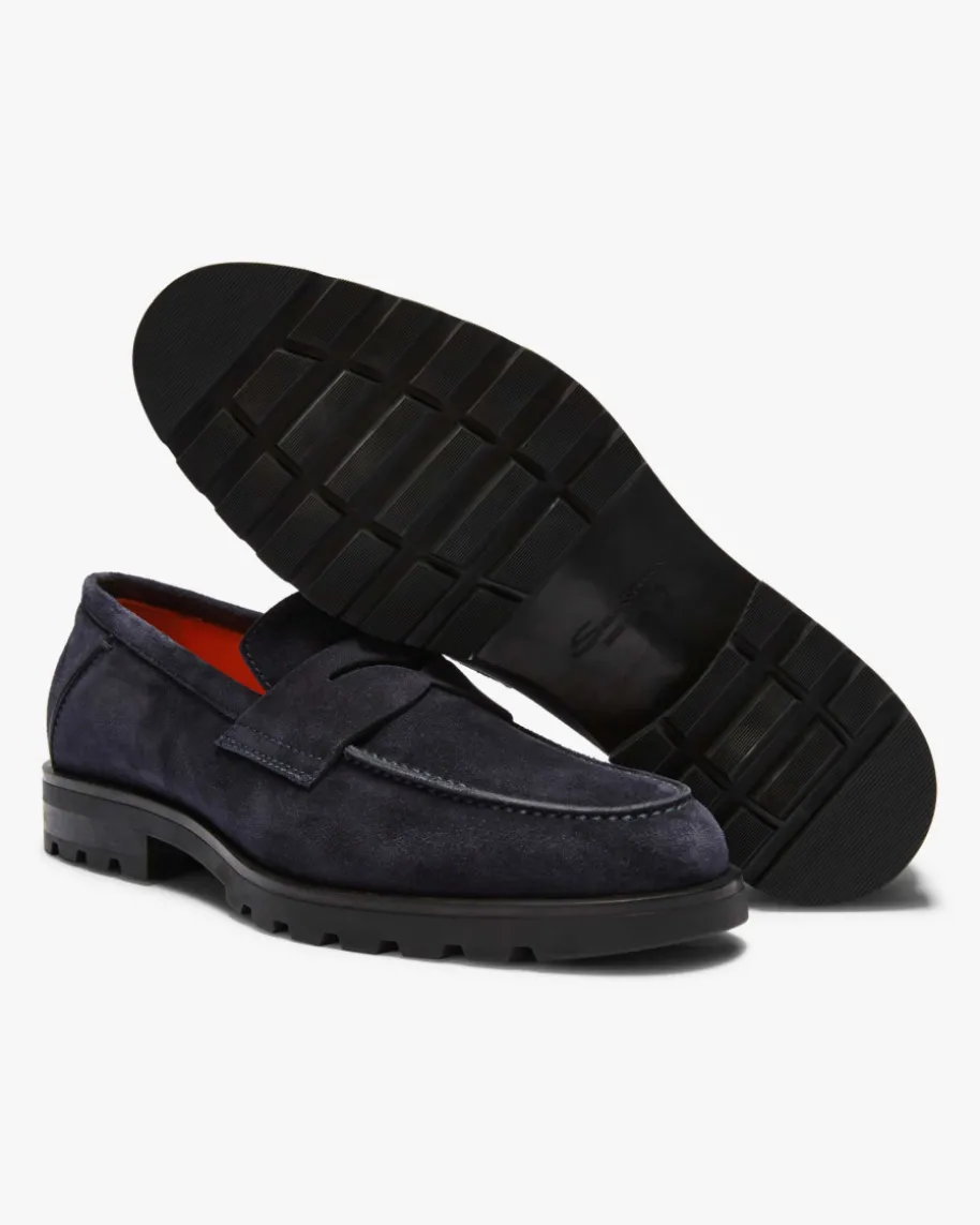 Neobsey Penny Loafer für Herren von Santoni in Navy. Das Modell präsentiert sichdank der hochwertigen, soften Veloursleder-Verarbeitung und klassischen Detailsin elegantem Look, während die Gummisohle eine legere Note verleiht.