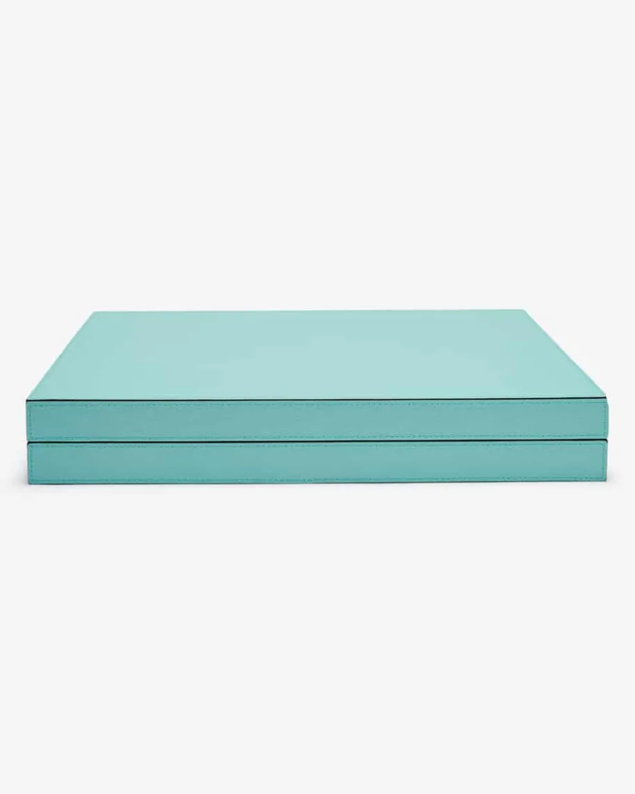 Noce Backgammon-Spiel von Giobagnara in Hellblau, Weiß und Grau. Dashandgefertigte Spiel der italienischen Manufaktur ist aus Walnussholz gefertigtund mit kratzfestem und wasserabweisendem Kalbsleder ummantelt. Die Spielsteineund Würfel finden stilsicher in einem Beutel aus Veloursleder ihren Platz.Zusätzlich ist die Unterseite mit rutschfestem Veloursleder versehen. Einexklusives Essential, das bei keinem Spieleabend fehlen darf.