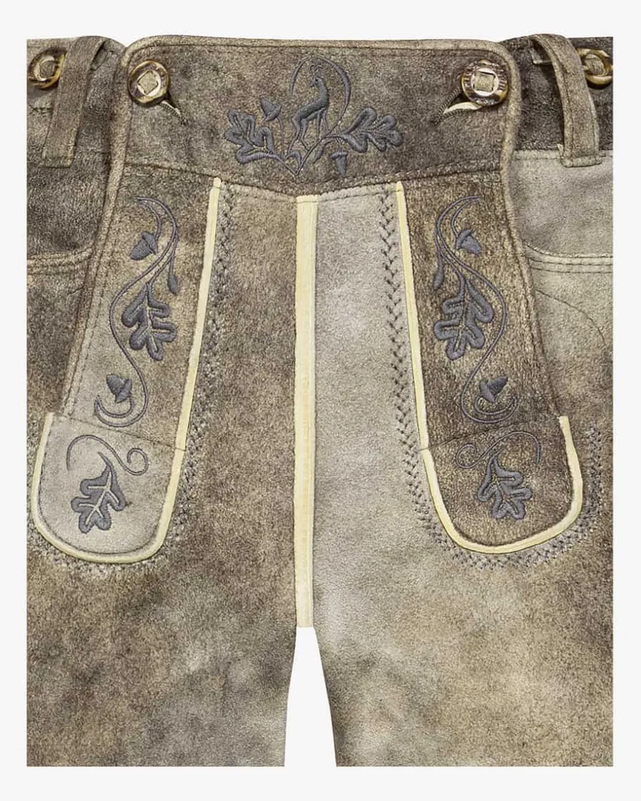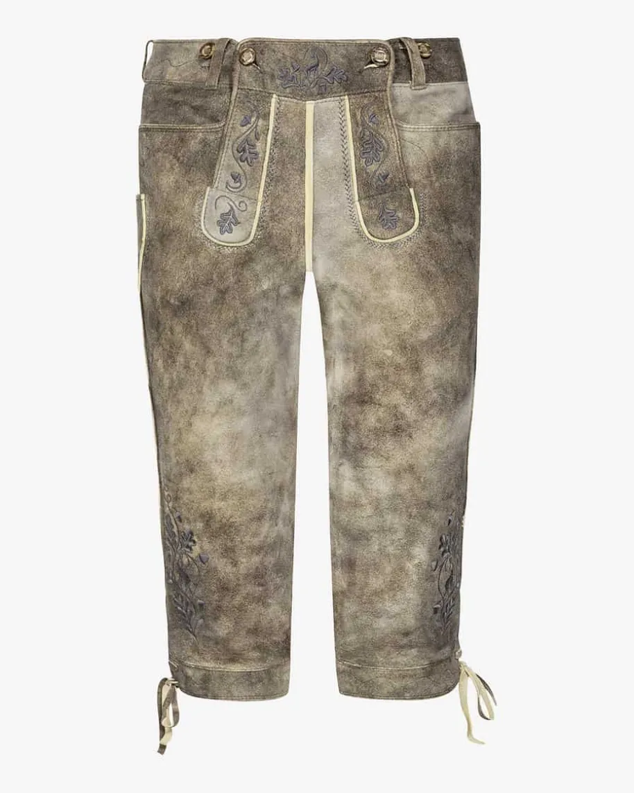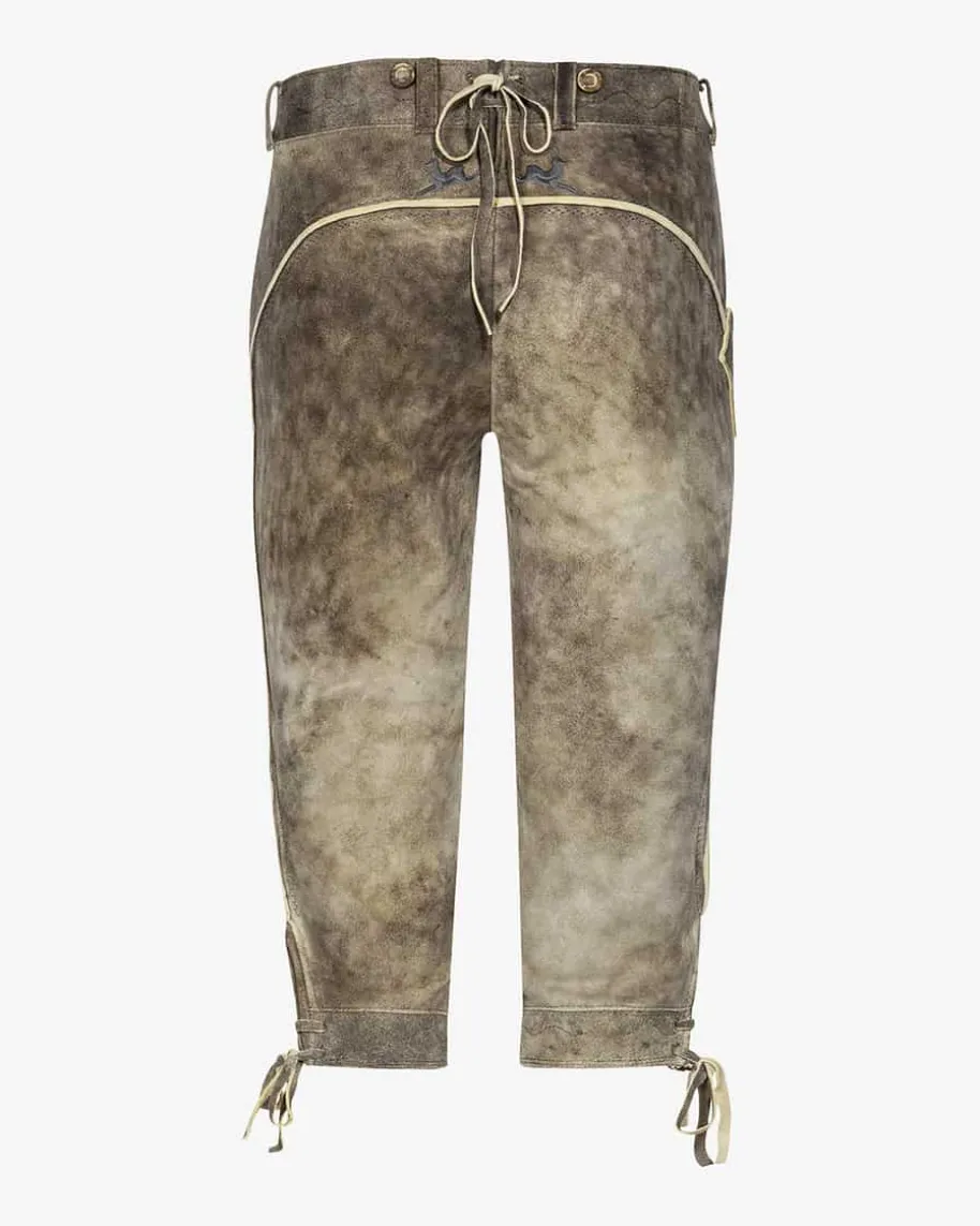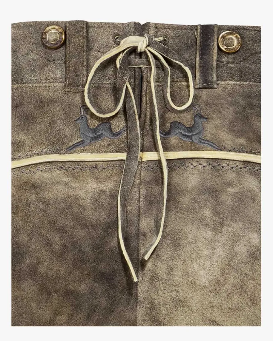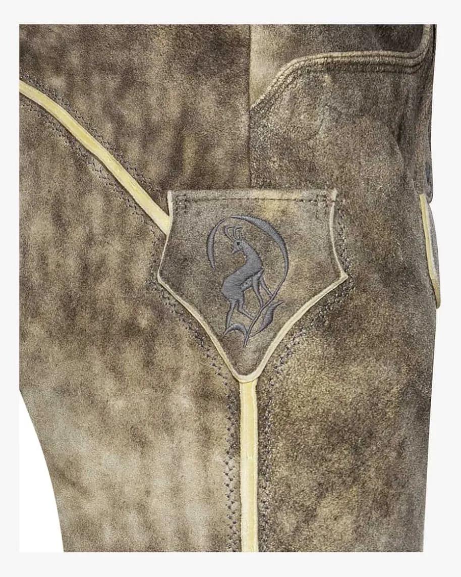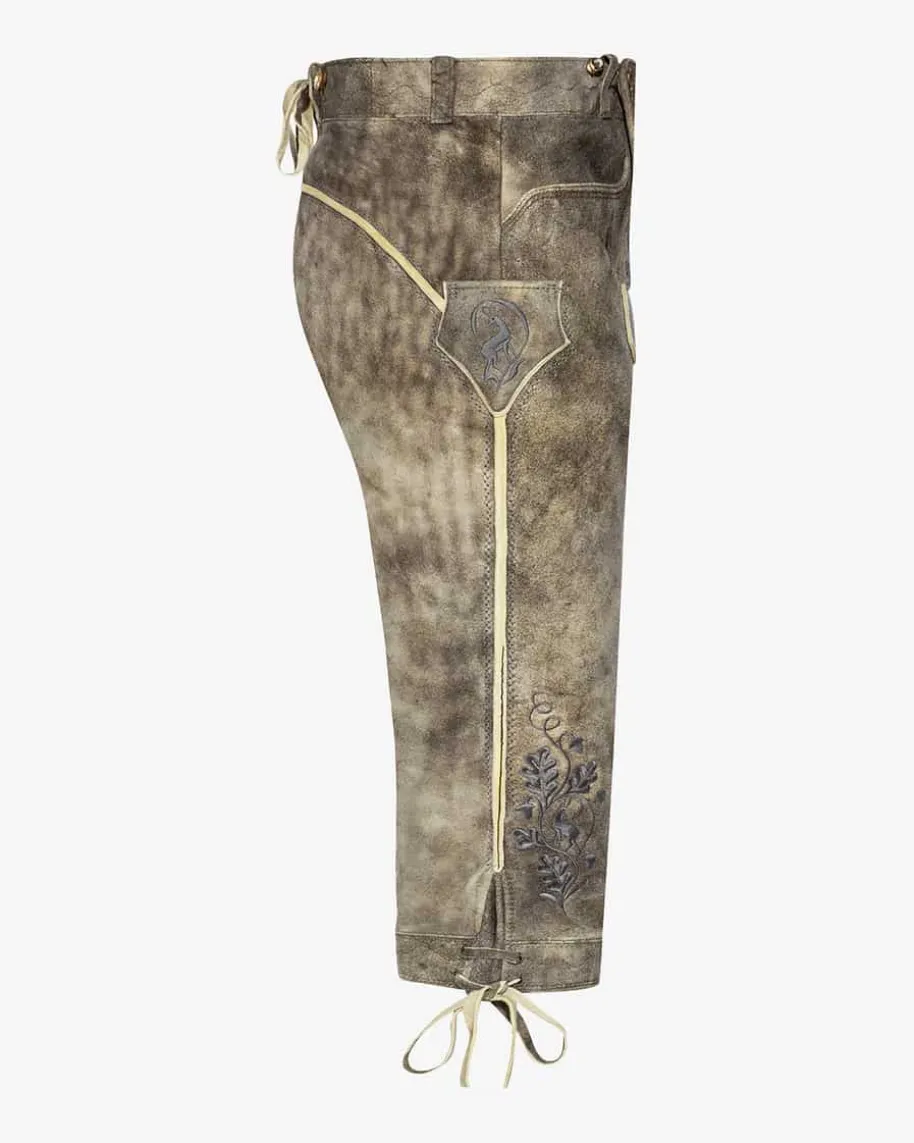 Nockerberg Trachten-Kniebundhose für Herren von Meindl in Old Grey. DieLederhose aus sämisch gegerbtem und mit Naturfarben handgefärbtem Lederüberzeugt durch kontrastierendeStickereien. Traditionelle Akzente setzen der geknöpfte Latz sowie dieLederbändchen am Beinabschluss, während die edle Naturfarbe den letzten Schliffverleiht.