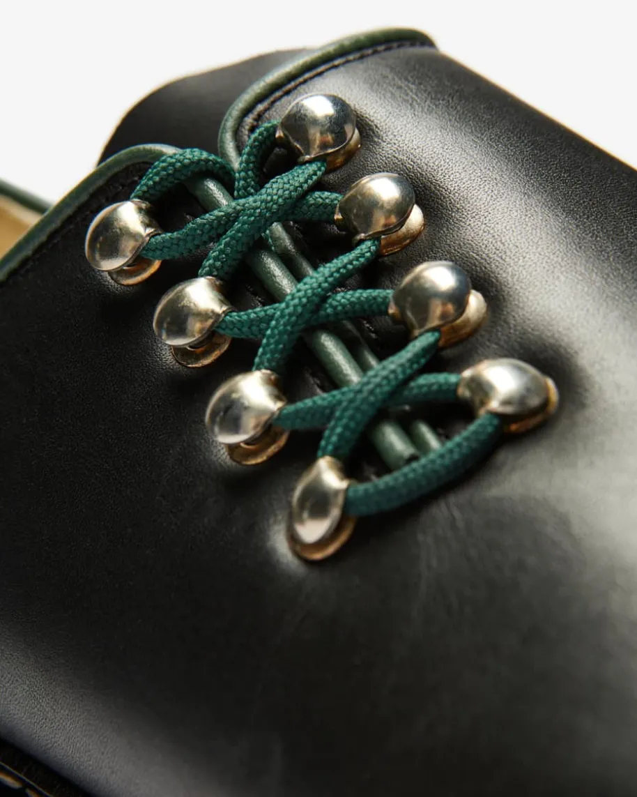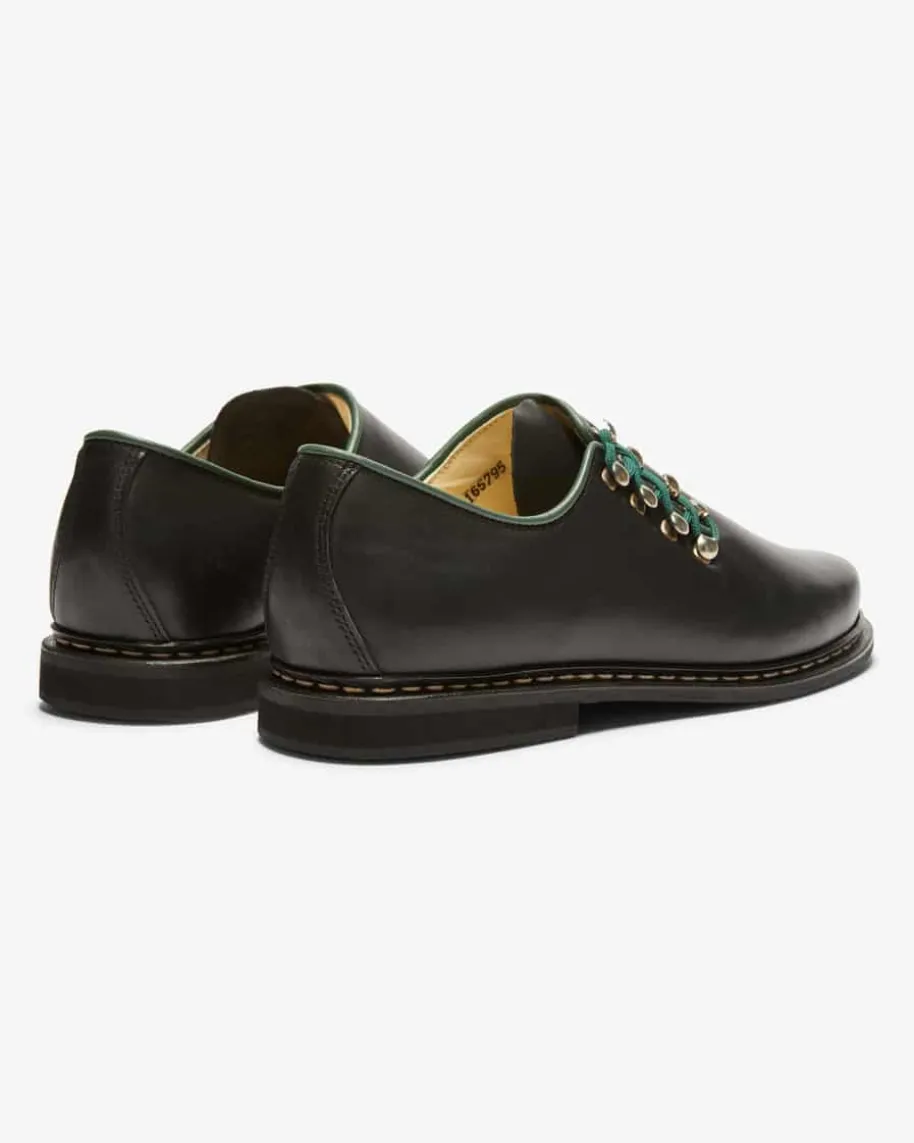 Oberland Haferlschuhe für Herren von Meindl in Schwarz. Die traditionelleAufmachung der Schuhe aus edlem Boxcalf-Glattleder wird durch ein seitlichesFädelsystem mit dunkelgrünen Schuhbändern sowie der Paspelierung elegantaufgewertet. Auch die Innenseite bietet dank anatomisch geformten Lederbrand-Sohle hohen Tragekomfort.