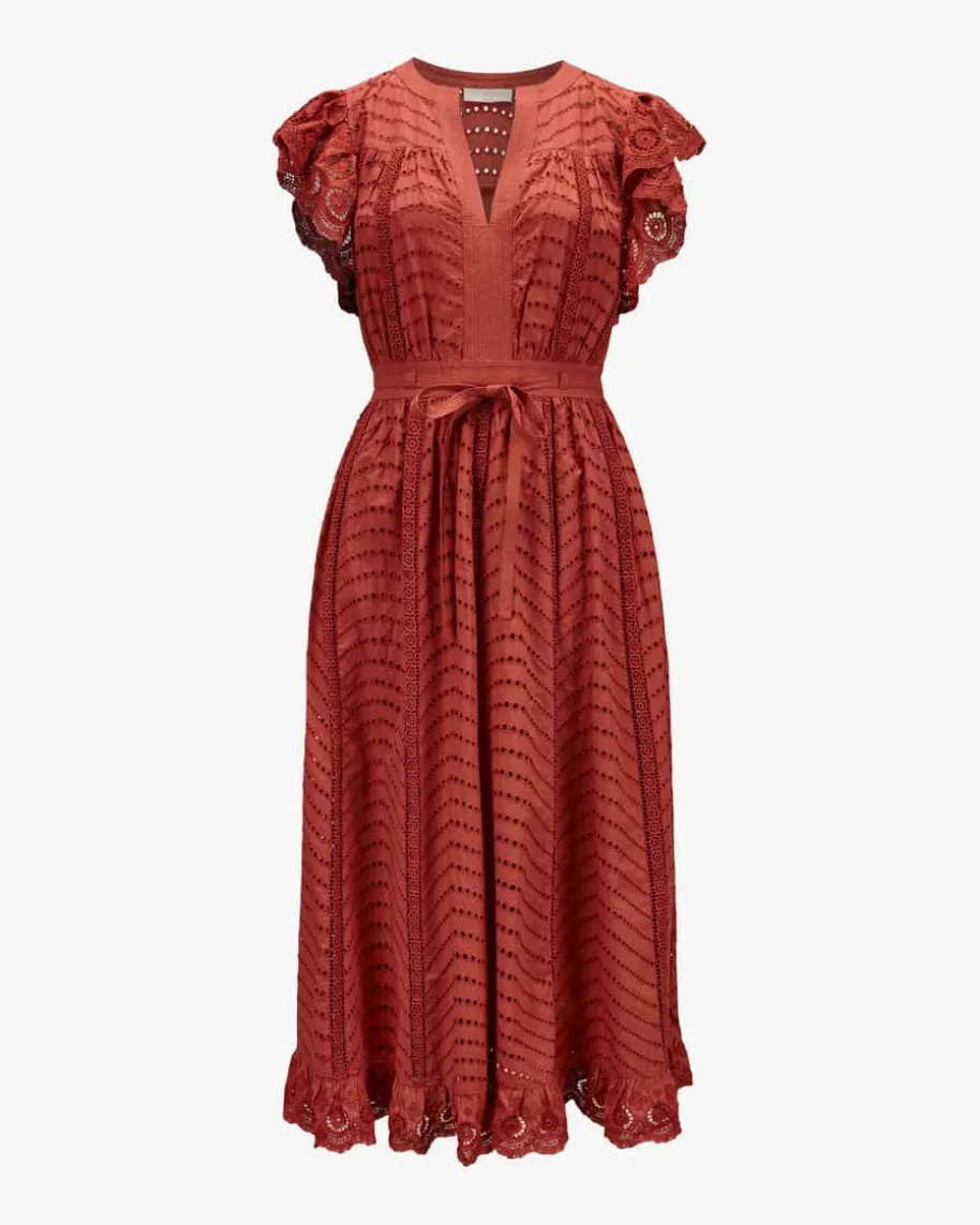 Olga Spitzenkleid für Damen von Ulla Johnson in Rostrot. Die New YorkerDesignerin steht für Boho-Luxus mit femininen Volants, Stickereien undfließenden Stoffen. Auch dieses Modell präsentiert sich in romantischerAufmachung, während die semi-transparente Lochspitze mit feinem Wellenmuster imBoho-Look einen stilvollen Begleiter kreieren. Die taillierte Passform mitabnehmbaren Taillenband zaubert eine feminine Silhouette und rundet das Designharmonisch ab.
