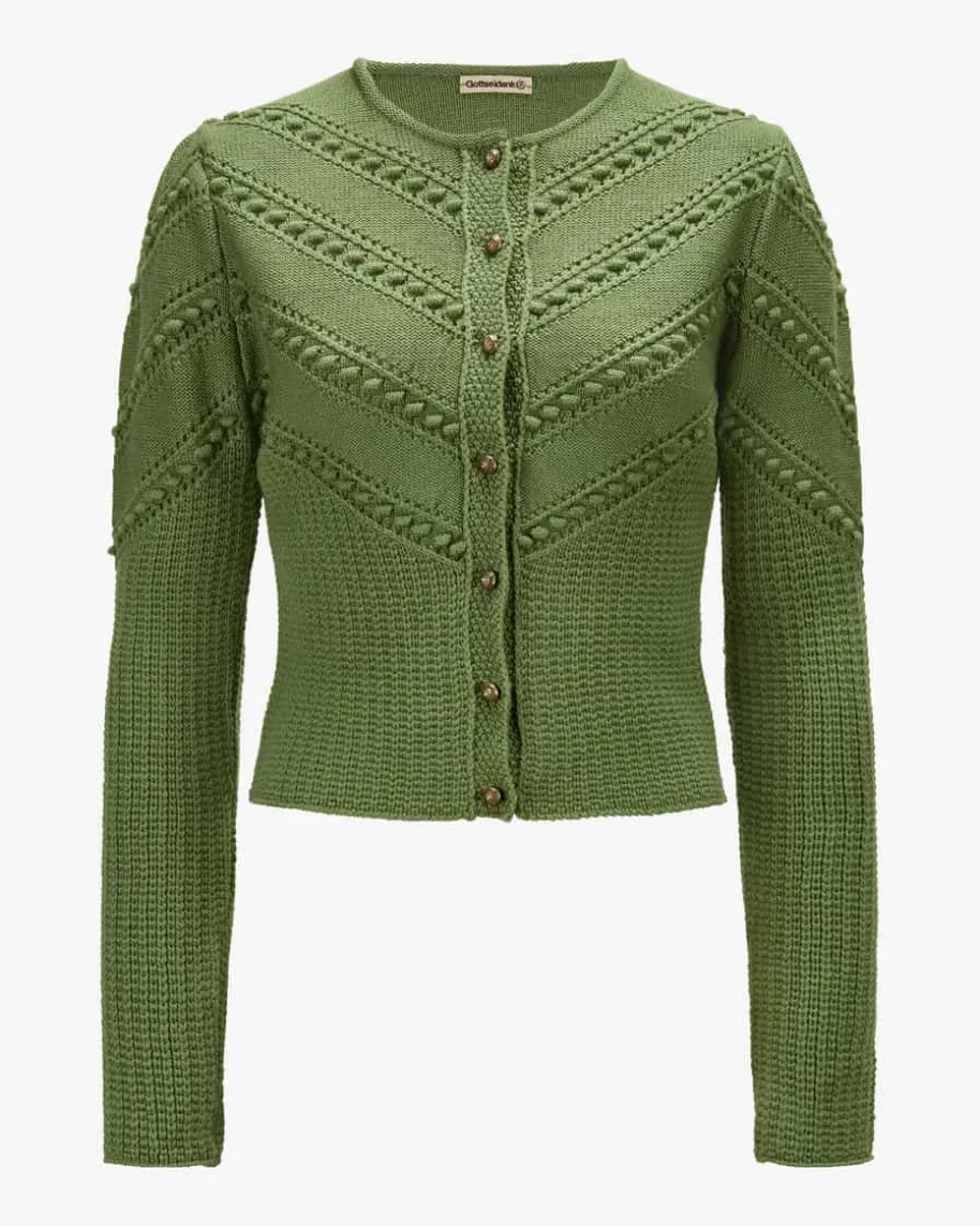 Ophelia Trachten-Strickjacke für Damen von Gottseidank in Grün. DieextrafeineMerino-Wolle in raffinierter Strick-Qualität punktet mit besonders angenehmemTragekomfort, während stilvolle Kugelknöpfe sowie die Raffungen an den Schulterndas traditionelle Modell gekonnt vollenden.