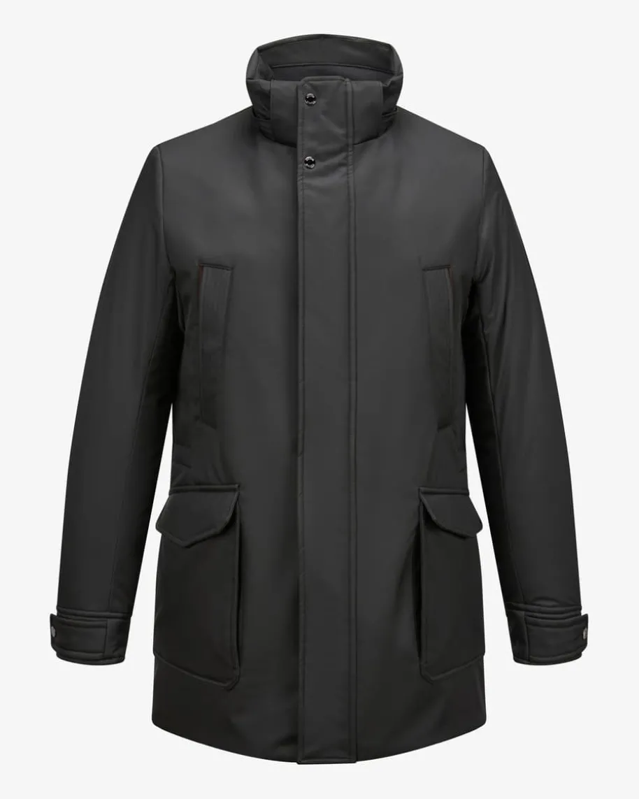 Oran Daunenparka für Herren von Moorer in Schwarz. Made in Italy – Das im NordenItaliens ansässige Label steht für hochwertige Jacken, gefertigt aus feinstenMaterialien und jedes Design steht für den klassischen Mode-Charme Italiens.Auch dieses Modell vereint maskulinen Charme mit funktionalen Eigenschaften.Während die hochwertige wärmeisolierende Daunen-Füllung optimalen Schutz vorKälte bietet, runden feine Details in Leder-Optik das Gesamtbild stilvoll ab.