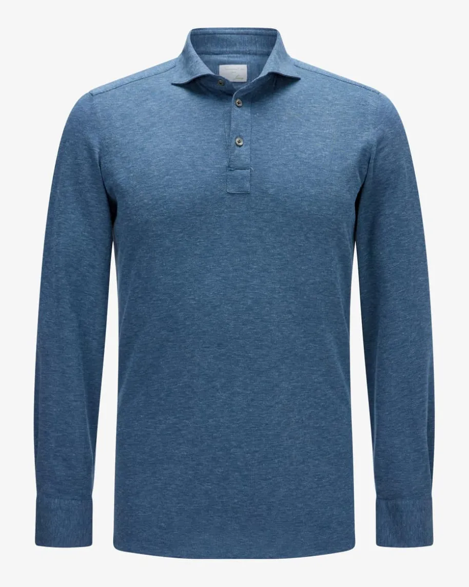Orlando Achile Langarm-Polo für Herren von Finamore 1925 in Blau. Das ausBaumwolle gefertigte Modell präsentiert sich dank der feinen Piqué-Qualität alsmodischer Favorit, während klassische Details das Gesamtbild in stilvollerAufmachung präsentieren.