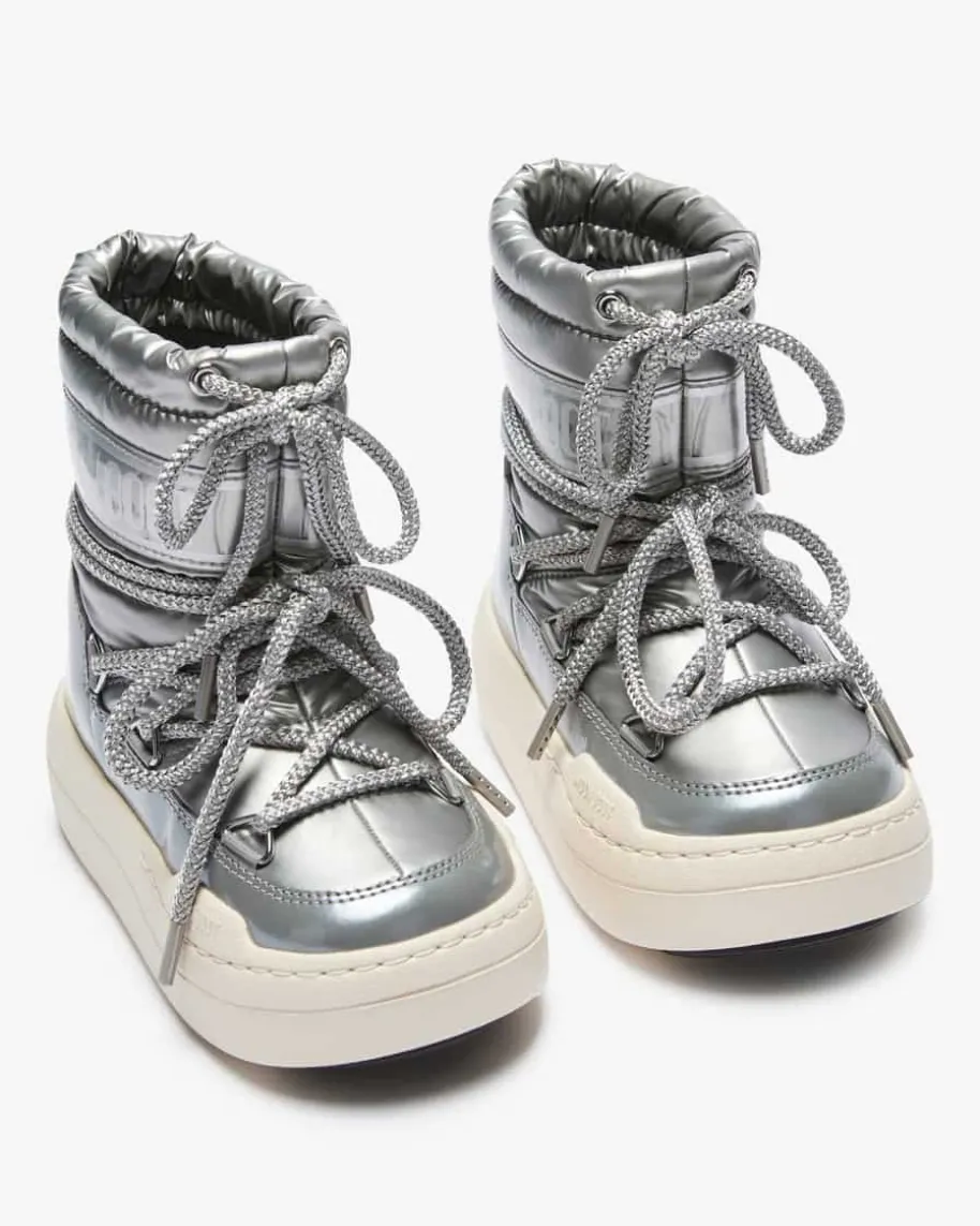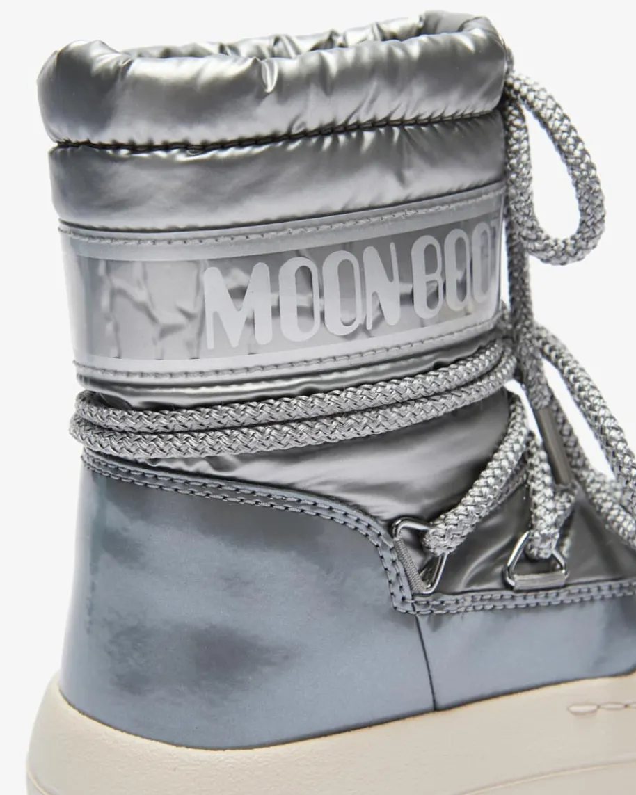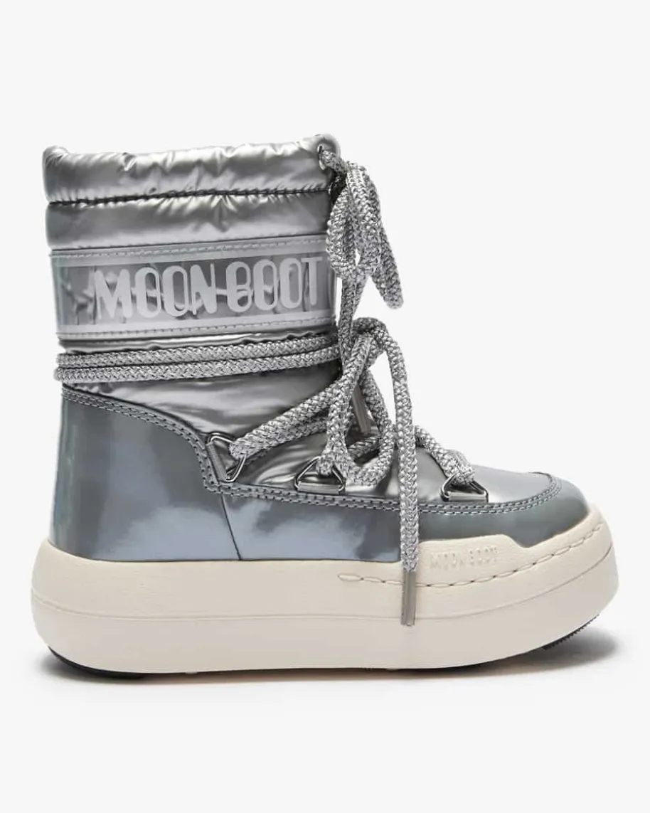 Park Moon Boots für Kinder von Moon Boot in Silber und Creme. Das in den1970er Jahren gegründete Label hat seine Inspiration in der Mondlandung von NeilArmstrong gefunden. Perfekter Begleiterfür unsere Kleinen – Der Klassiker für kaltes Wetter mitwasserabweisender und besonders wärmender Beschichtung präsentiert sich ingewohnt futuristischer Aufmachung mit geschnürtem Schaft, inklusive dercharakteristischen Logo-Applikationen.