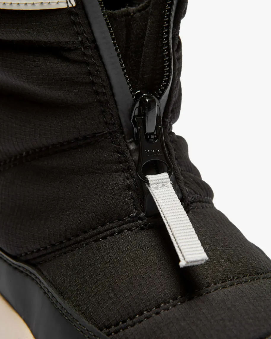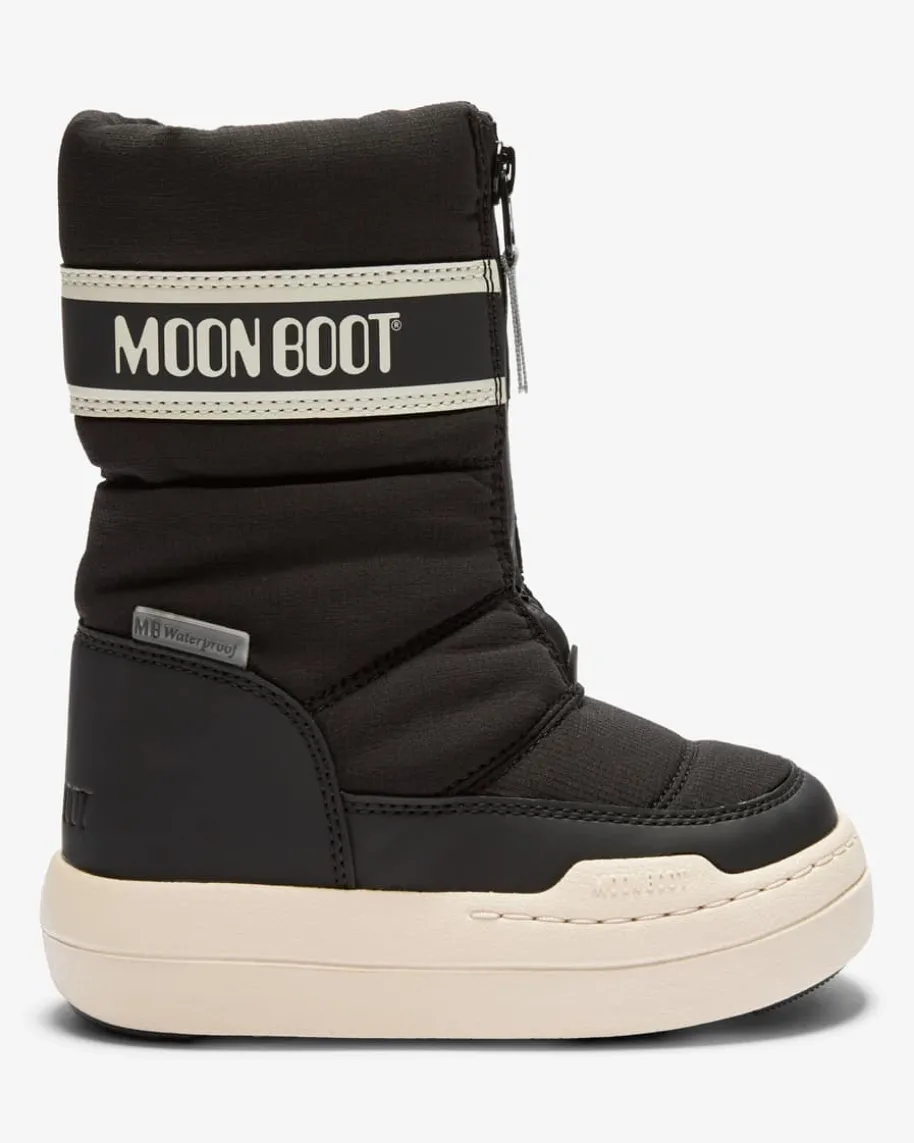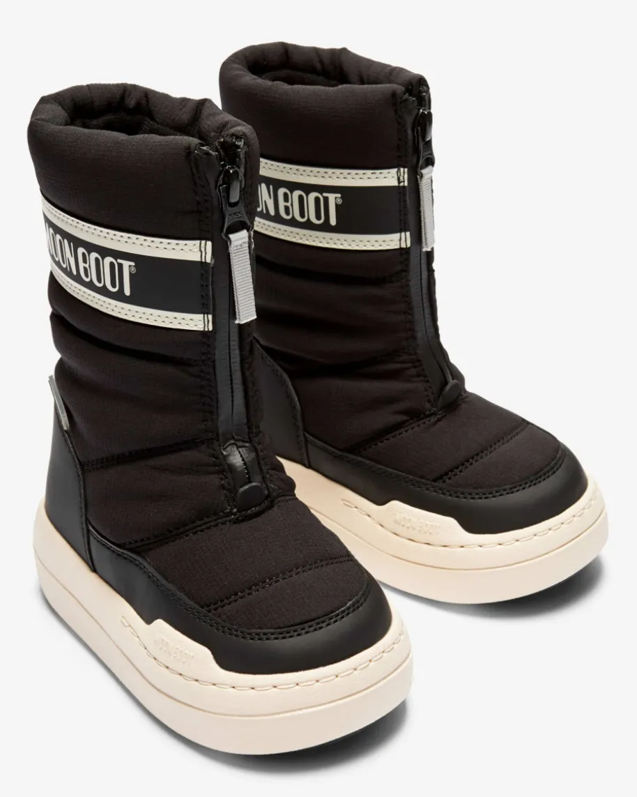 Park Zip High Boots für Kinder von Moon Boot in Schwarz und Weiß. Das in den1970er Jahren gegründete Label hat seine Inspiration in der Mondlandung von NeilArmstrong gefunden. Ein perfekter Winter-Begleiter für die Kleinen – DerKlassiker für kaltes Wetter mit wasserabweisender Beschichtung und warmemFleece-Innenfutter präsentiert sich in gewohnt futuristischer Aufmachung mitpraktischem Reißverschluss und sportiven Steppnähten.