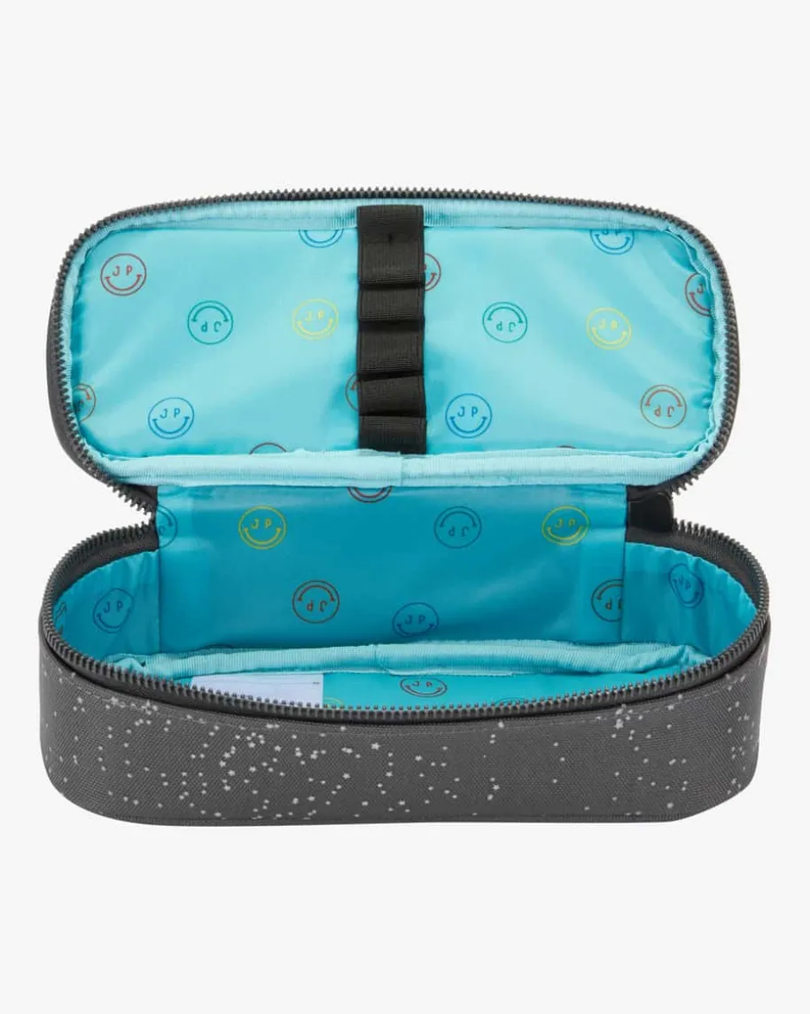 Pencil Box Federmäppchen für Kinder von Jeune Premier in Dunkelgrau und Bunt.Diese Box überzeugt mit kreativen Applikationen, während die Gummibänder zudemfür Ordnung sorgen.