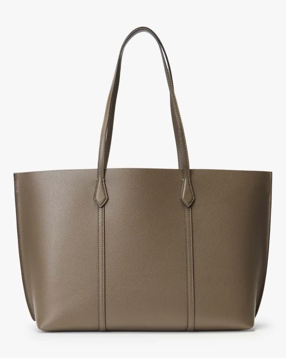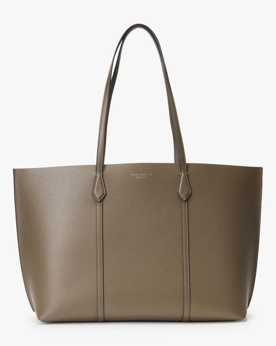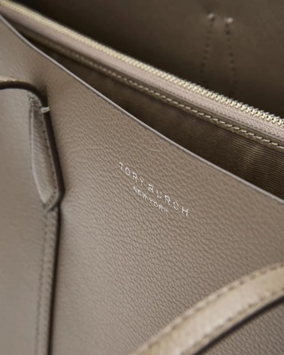 Perry Tote Henkeltasche für Damen von Tory Burch in Taupe. Das Shopper-Modellpräsentiert sich dank genarbter Leder-Qualität in hochwertiger Aufmachung,während das minimalistische Design mit schmalen Henkeln einen zeitlos-elegantenBegleiter kreiert. Das große, herausnehmbare Necessaire mit Außenfach bietetzudem vielseitige Einsatz-Möglichkeiten und sorgt für eine smarte Unterteilung.