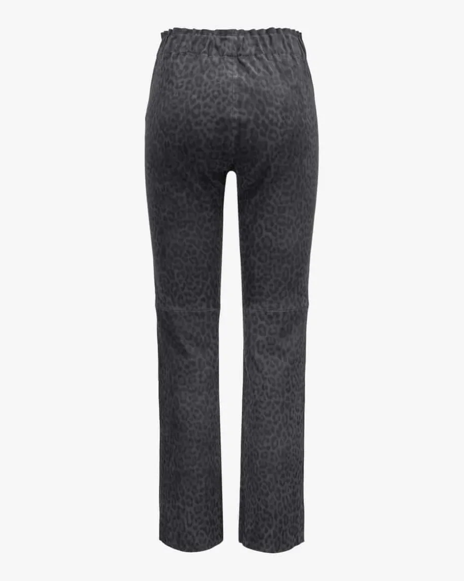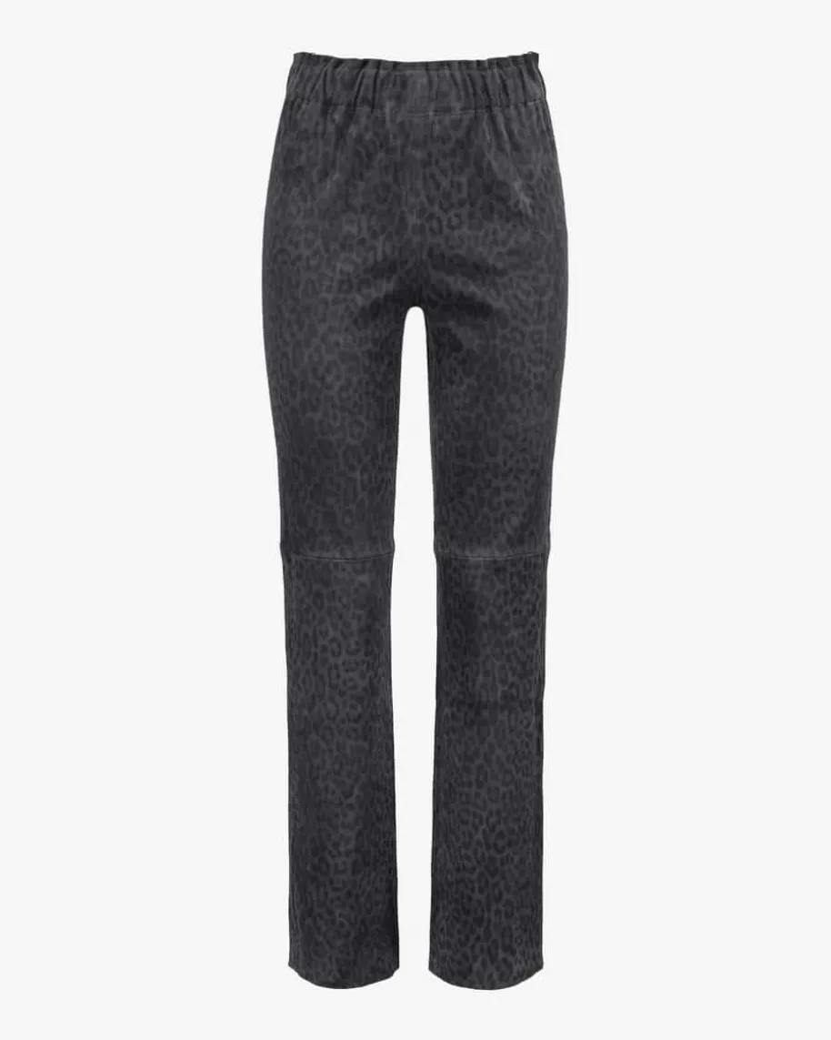 Pheline Leo Lederhose für Damen von Iris von Arnim in Anthrazit und Schwarz. DasModell in hochwertigem Lammleder, überzeugt mit angenehmen Tragemomenten,während die klassischen Details und das moderne Leoparden-Dessin das Gesamtbildharmonisch abrunden.