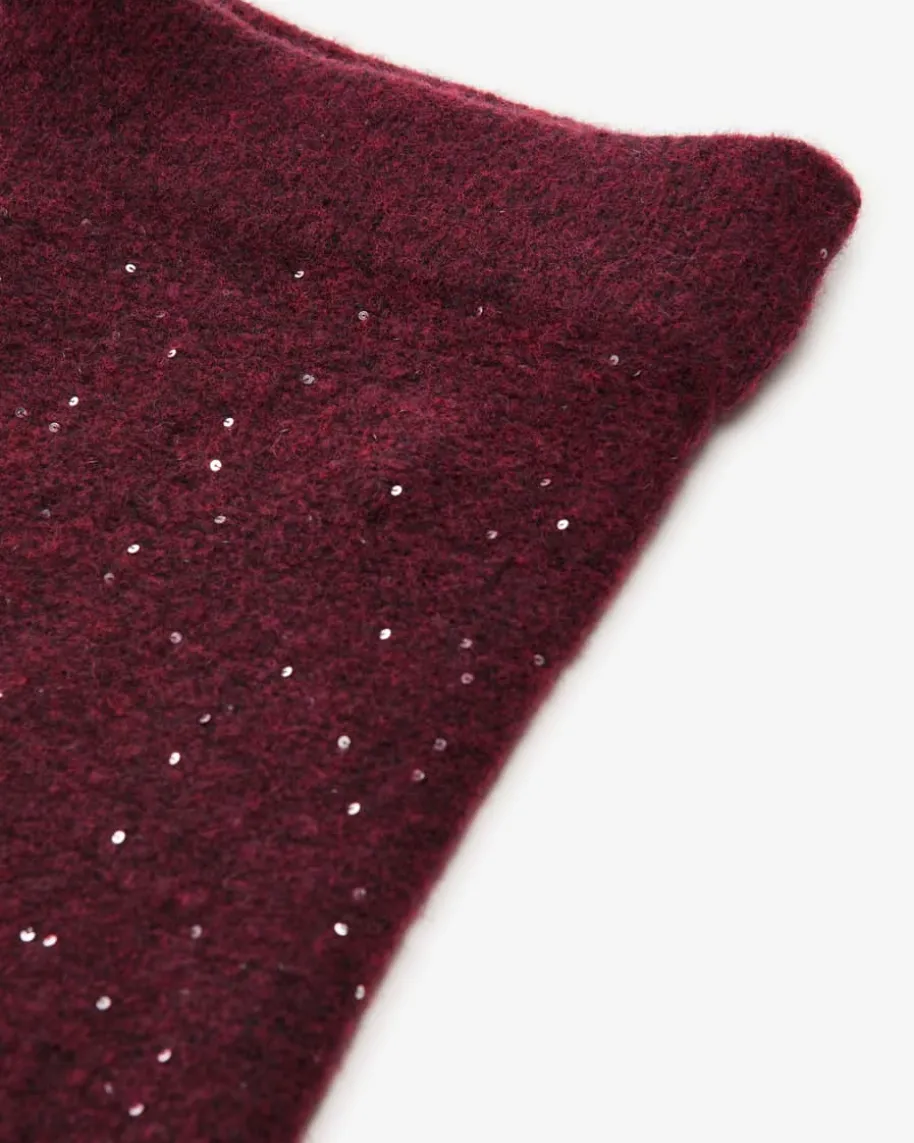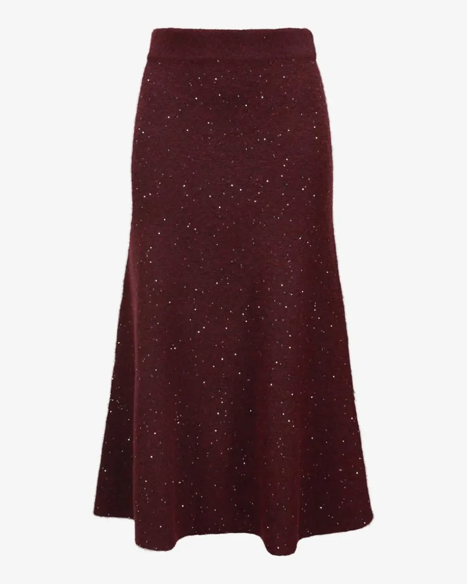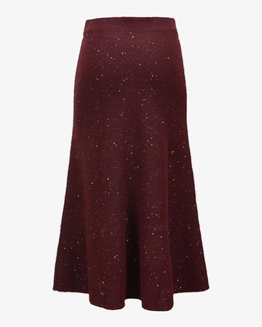 Picton Strickrock für Damen von Lu Ren in Burgundy. Dank der Verwendung vonhochwertigem Cashmere-Mix besticht das Modell mit weicher und elastischerStrick-Qualität, während die zarten Pailletten-Applikationen einen stilvollenFavoriten für Ihre Herbst-Winter-Garderobe schaffen.