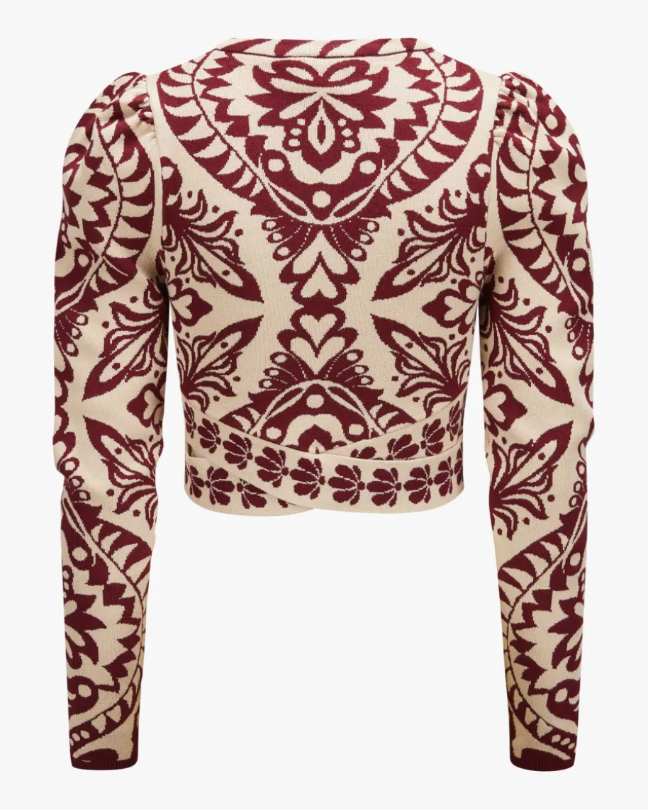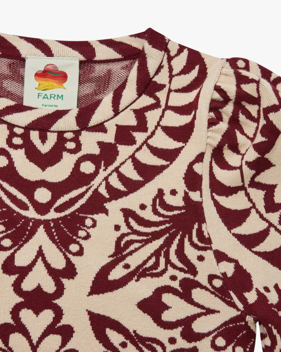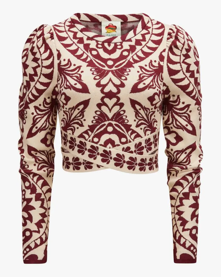 Pineapple Love Pullover für Damen von Farm Rio in Bordeaux und Sand.Brasilianische Marke voller Farben, Prints und Lebensfreude. Inspiriert vomtropischen Lebensgefühl bringt sie positive Energie in die Modewelt. Auch diesesModell begeistert mit leichtem Viskose-Mix und schmaler, verkürzter Passform,welche dank Cut-Outs in Wickel-Optik an der Taille feminin in Szene gesetztwird. Der extravagante Jacquard-Strick mit Ananas-Motiv vollendet den Look mitbesonderem Flair. Das Modell kann mit dem passenden Rock als modisches Setgetragen werden.