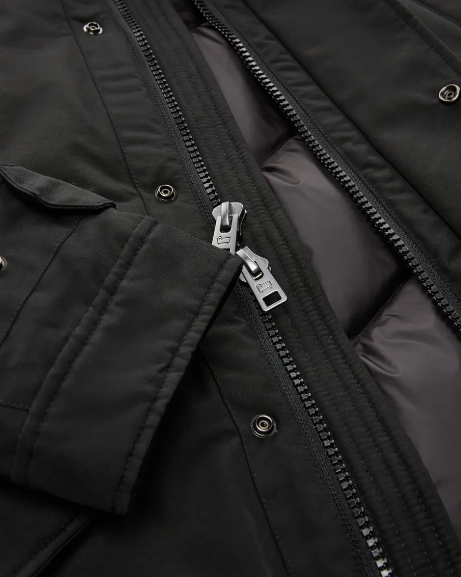 Daunenjacke für Herren von Woolrich in Schwarz. 1830 von John Rich inPennsylvaniagegründet, erfreute sich das Label damals schon großer Beliebtheit – vor allemim Outdoor-Bereich. Robuste funktionale Jacken, Parkas und Mäntel standen dabeiim Vordergrund und bilden, neben der dazugekommenen Freizeitmode, nach wie vorimmer noch den Mittelpunkt der vielseitigen Kollektionen von Woolrich. DasModell begeistert mit zeitlosem Design und wärmespendender Daunen-Füllung,während der abnehmbare Echtfellbesatz einen luxuriösen Charme verleiht.