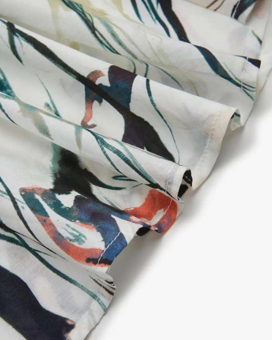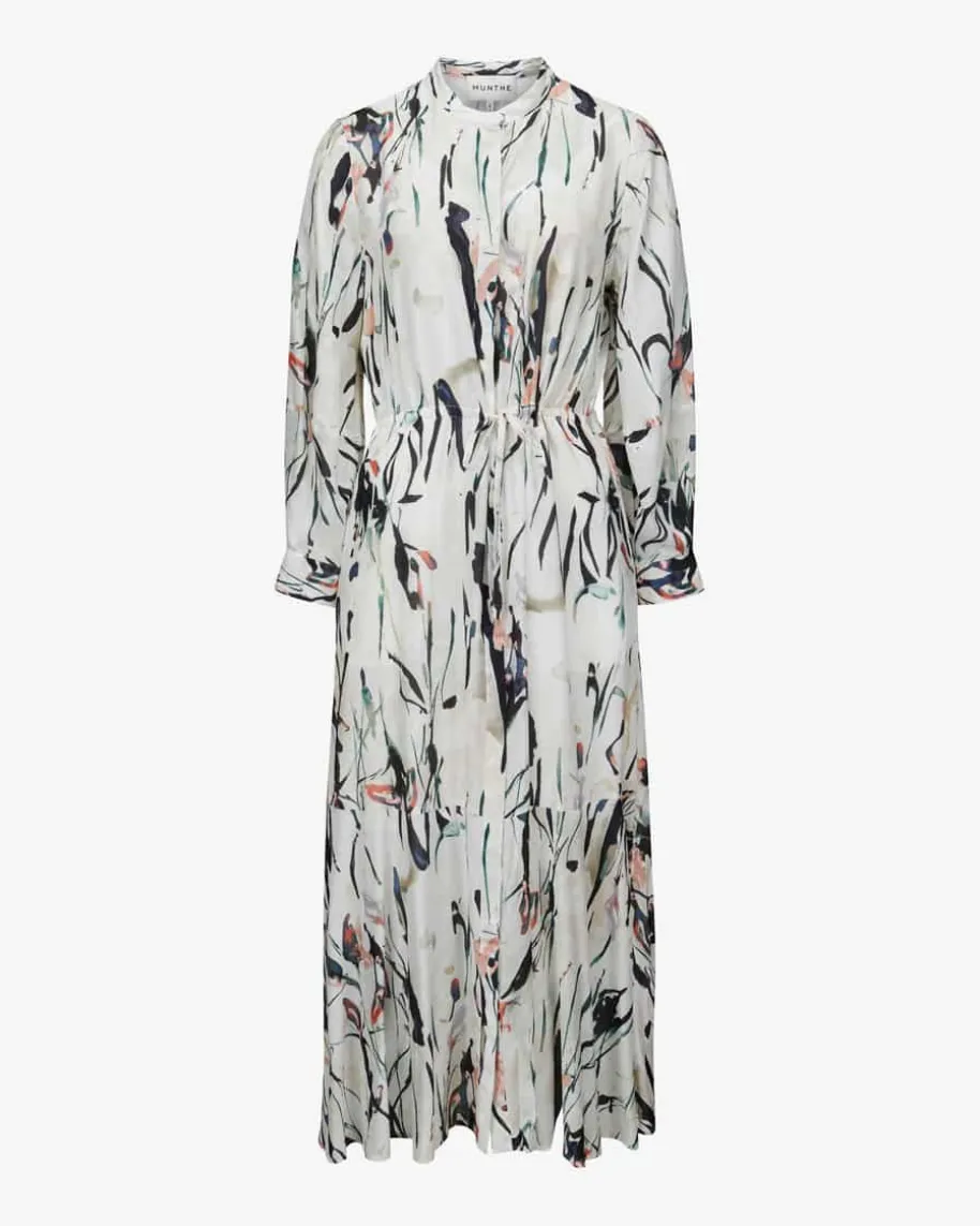 Portland Kleid für Damen von Munthe in Weiß und Bunt. Das Modell überzeugt infließend und zugleich leichter Haptik, während das farbenfrohe Dessin und dermoderne Ärmel in Ballonform das Gesamtbild gekonnt vollenden.