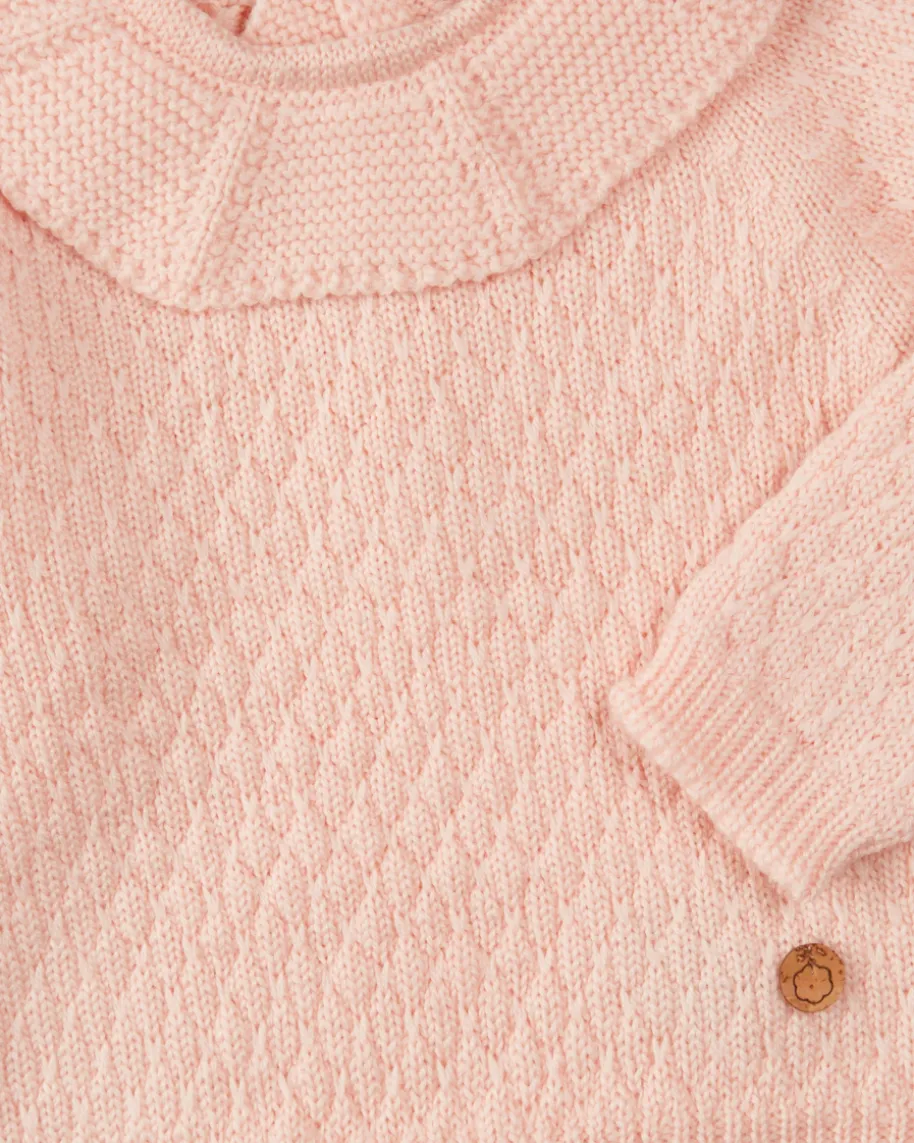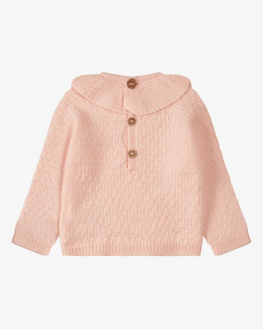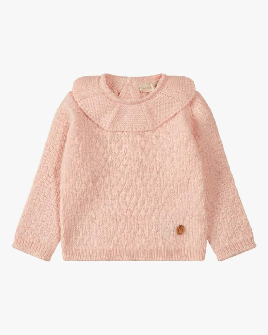 Pullover für Mädchen von Wedoble in Rosa. Das Modell punktet mit angenehmerMerinowoll-Qualität, die Ihrem Liebling einen hohen Tragekomfort bietet, währenddas feine Waffelstrickmuster und der süße Kragen das Design harmonisch abrunden.