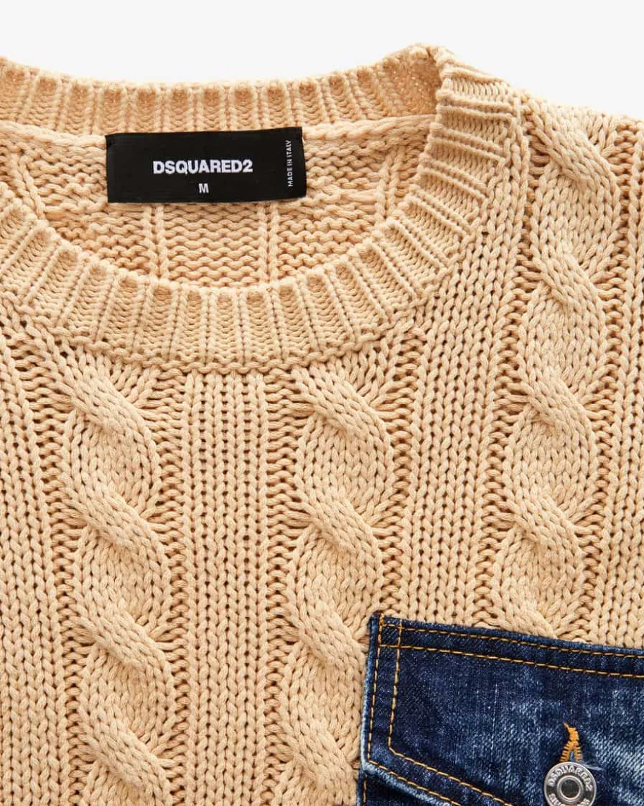 Pullover für Herren von Dsquared2 in Camel, Blau und Schwarz. Dieses Modellbesticht dank des Zopfmusters sowie der aufgesetzten Denim-Tasche im Vorderteilals modischer Streetstyle-Begleiter.