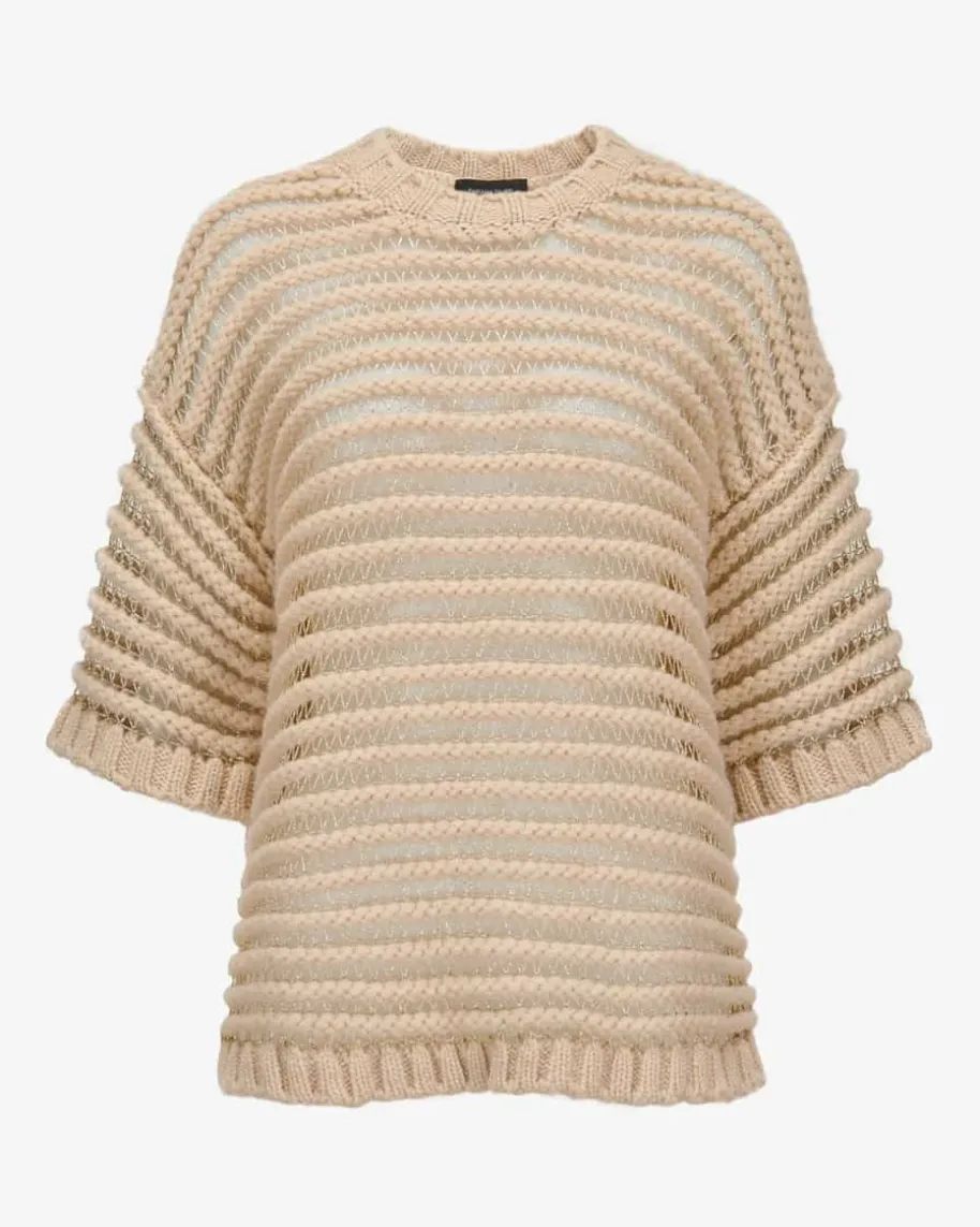 Pullover für Damen von Fabiana Filippi in Sand und Gold. Das Modell präsentiertsich in raffinierter Netz-Optik, die durch den Mix des edlen Kamelhaares mit denmetallisierten Fasern einen einzigartigen Look erhält. Die Oversize-Passformrundet das Gesamtbild modisch ab.