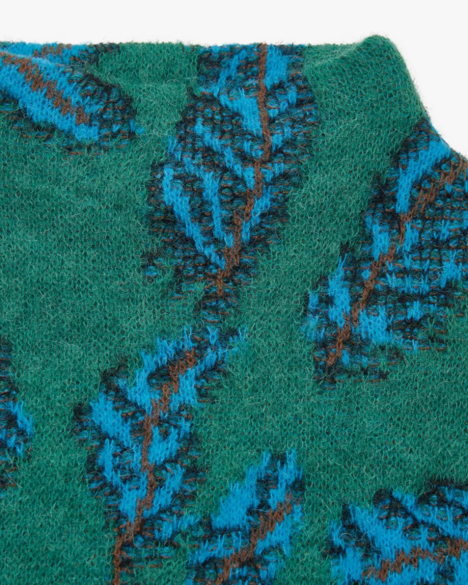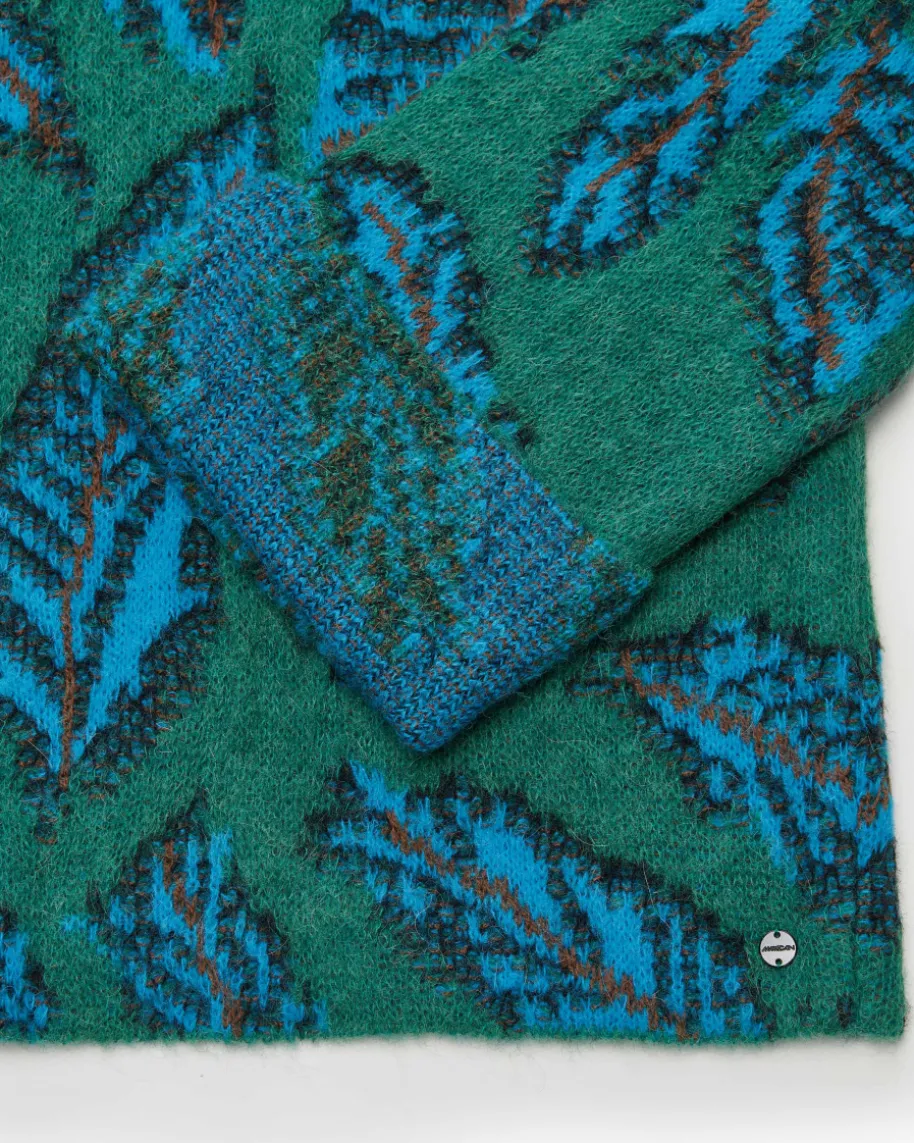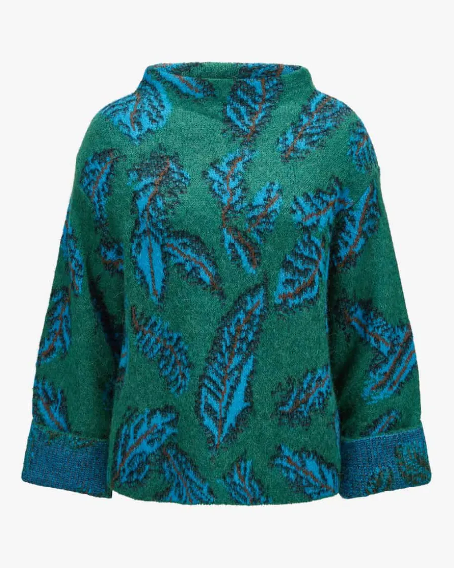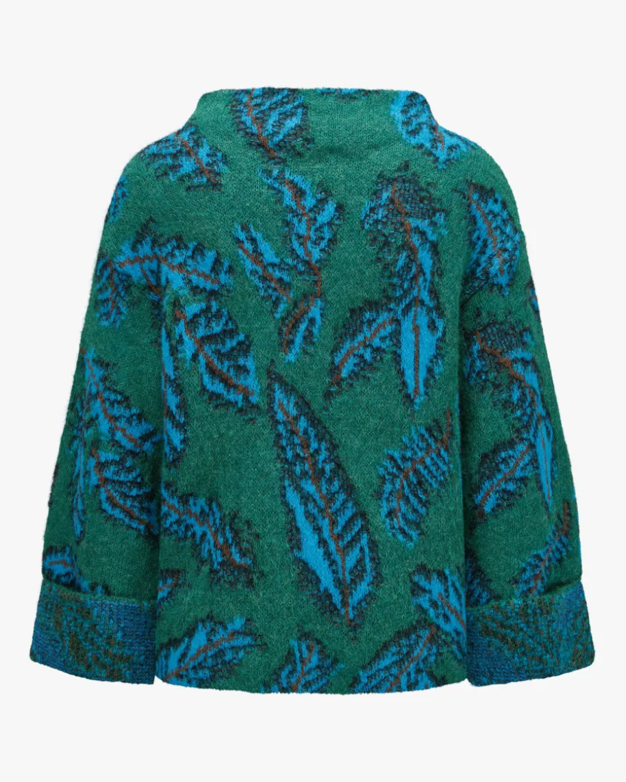 Pullover für Damen von Marc Cain in Jade, Türkis und Braun. Die Deutsche Markesteht für selbstbewusste, feminine Looks. Kombistarke Designs mit hohemQualitätsanspruch – bekannt für Prints & Strick. Auch dieses Modell in besondersangenehmer Haptik überzeugt mit kreativem Blätter-Muster, während die weiteSilhouette mit Stehkragen und verkürzten Ärmeln einen modischen Favoritenkreiert.