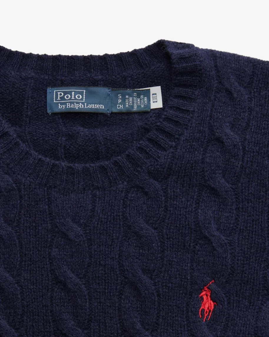 Pullover für Damen von Polo Ralph Lauren in Navy. Das Modell begeistert durchden besonders weichen Wolle-Cashmere-Mix mit hohem Tragekomfort. Stilvollabgerundet wird das Design durch die kontrastierende Logo-Stickerei auf derBrust sowie das klassische Zopf-Strickmuster.