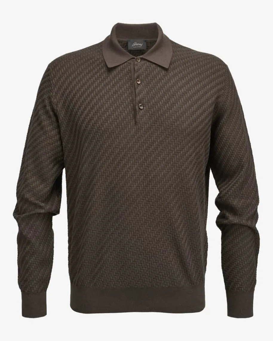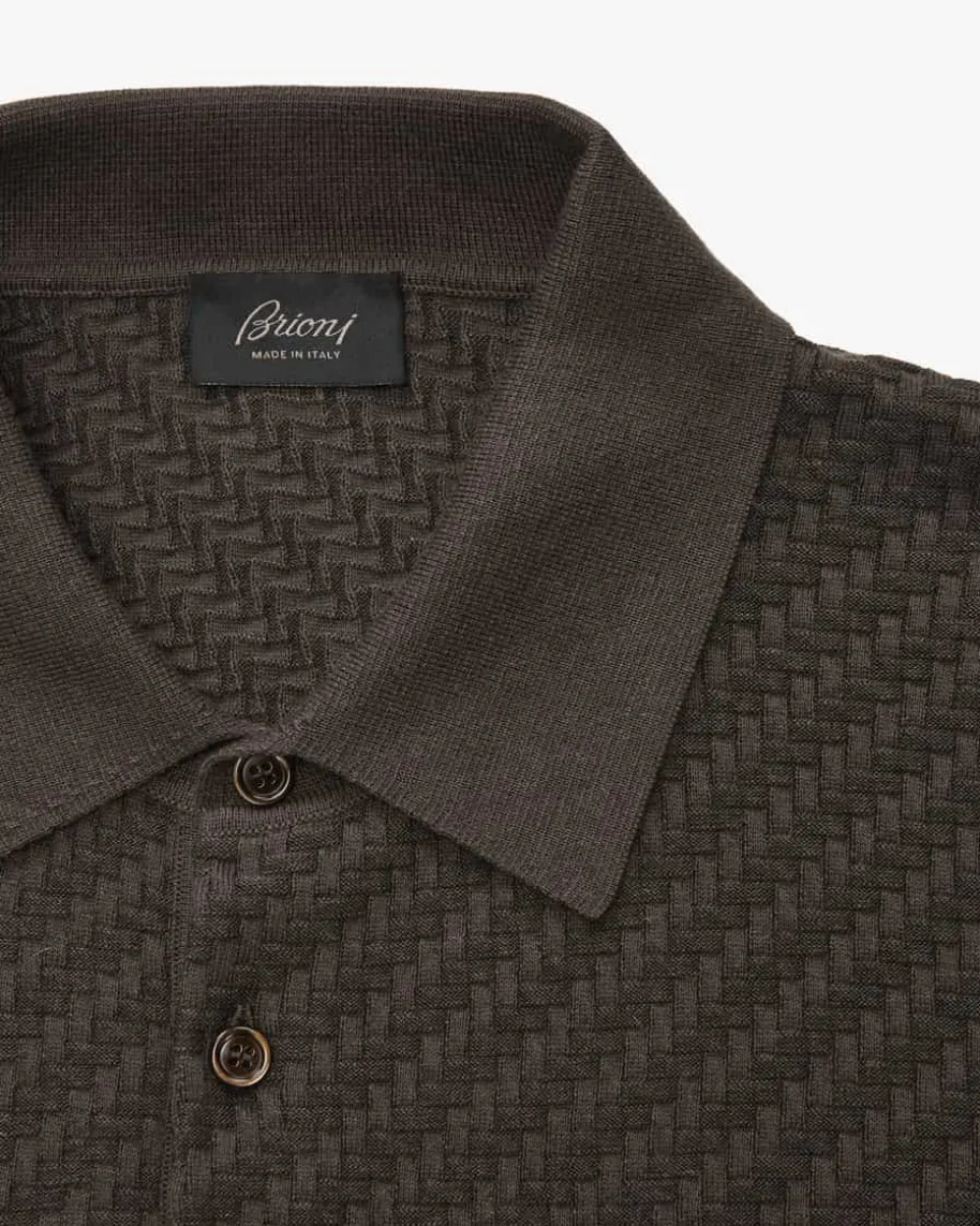 Pullover für Herren von Brioni in Dunkelbraun. Dank der Verwendung vonhochwertiger Superfine 120s Merinowolle mit Seide und Cashmere garantiert dasleichte Modell angenehme Tragemomente. Das raffinierte Flecht-Strickmuster undder sportive Polokragen kreieren einen legeren Look.