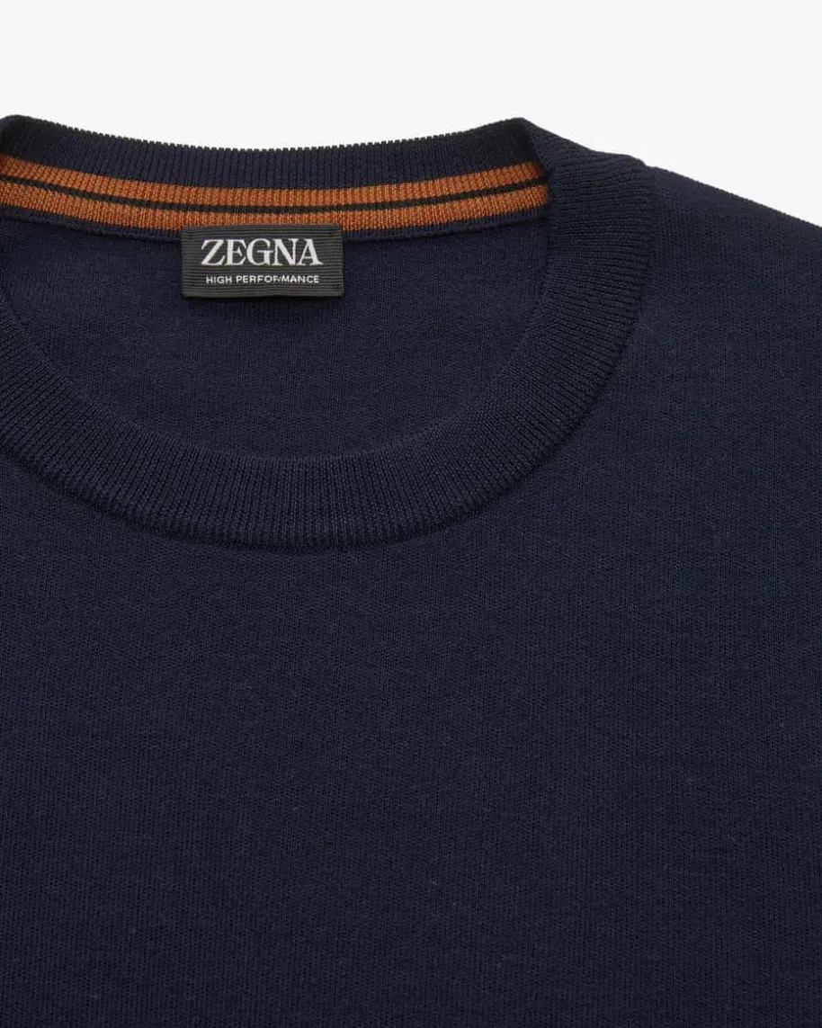 Pullover für Herren von Zegna in Navy und Terrakotta. Das Modell ausatmungsaktiver, strapazierfähiger High Performance-Merinowolle überzeugt imschlichten Design, während Kontraststreifen den Look sportiv in Szene setzen undso ein weiches Essential im Alpine Chic-Style kreieren.