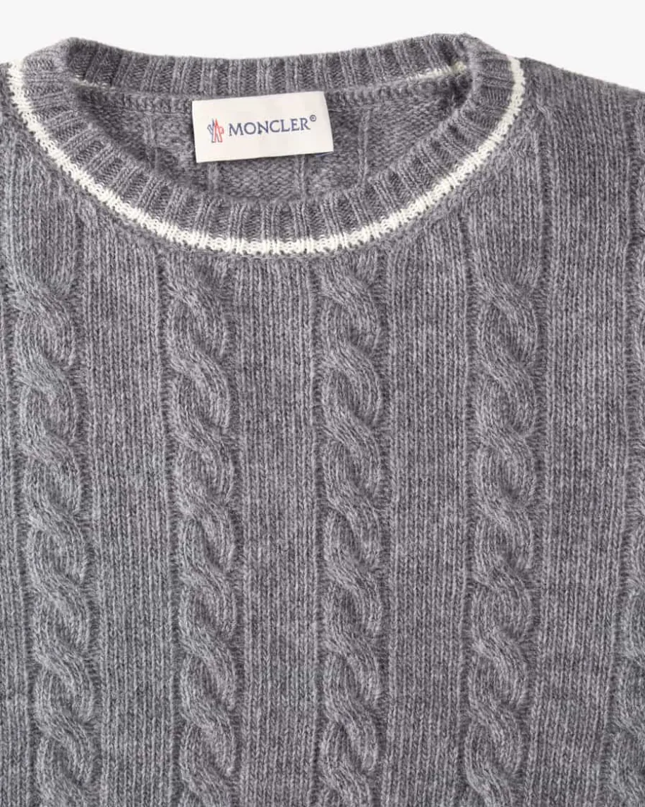 Pullover für Kinder von Moncler Enfant in Grau und Off-White. Dank derhochwertigen Schurwoll-Verarbeitung verspricht das Modell einen angenehmenTragekomfort, während die sportive Farbkombination sowie das klassischeZopfstrickmuster das Gesamtbild harmonisch vollenden.