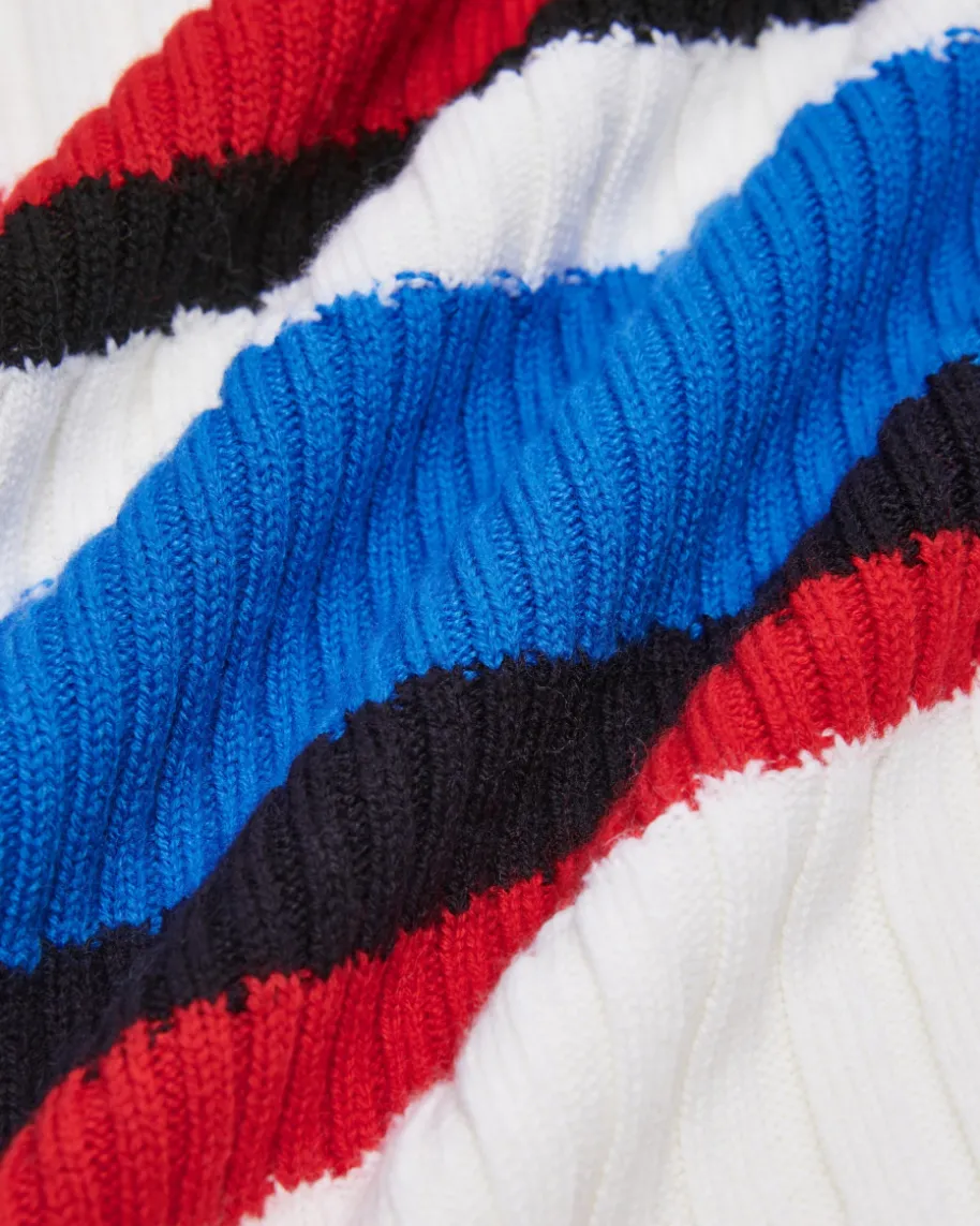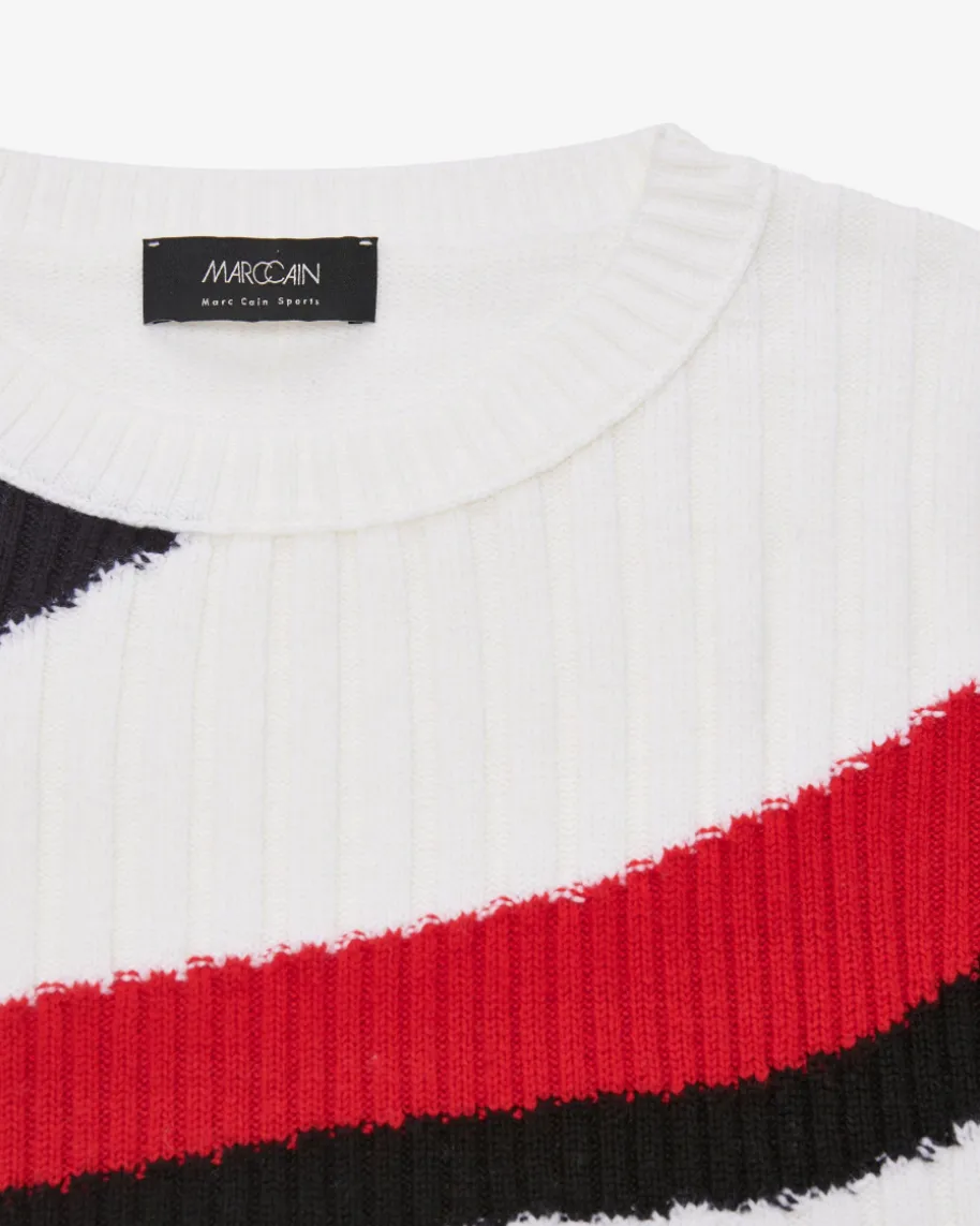 Pullover für Damen von Marc Cain in Off-White, Blau und Rot. Die deutsche Markesteht für selbstbewusste, feminine Looks. Auch dieses Modell präsentiert sichmit weicher Woll-Qualität, die angenehme Tragemomente garantiert. Das grafischeStrickmuster mit stilvollem Retro-Touch rundet das Design gekonnt ab.