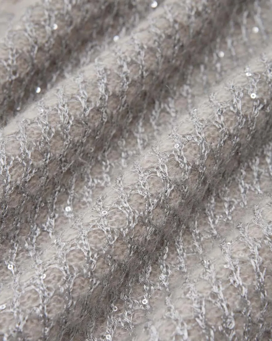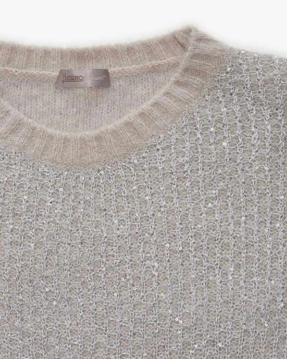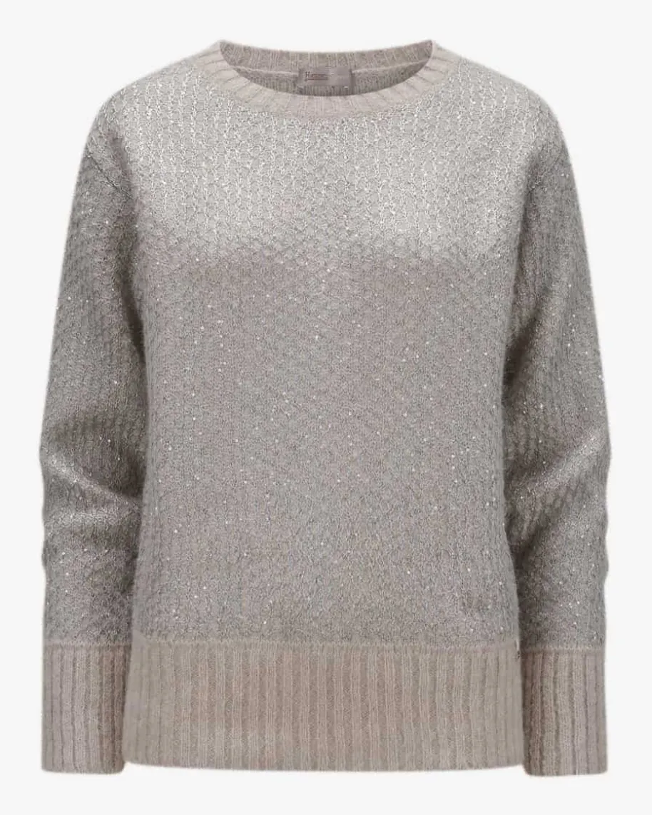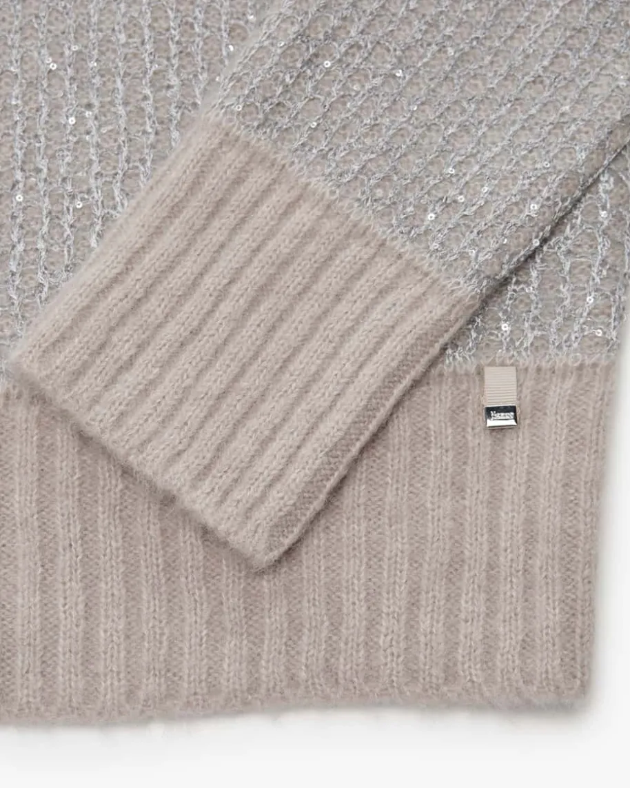 Pullover für Damen von Herno in Sand und Silber. Das Modell begeistert mit edelschimmernder Pailletten-Strick-Verarbeitung und legerer Passform mitüberschnittenen Schultern. – Ein Hingucker für modische Looks. Der hochwertigeAlpaka-Woll-Mix überzeugt mit besonders weichem Griff und rundet den Styleharmonisch ab.