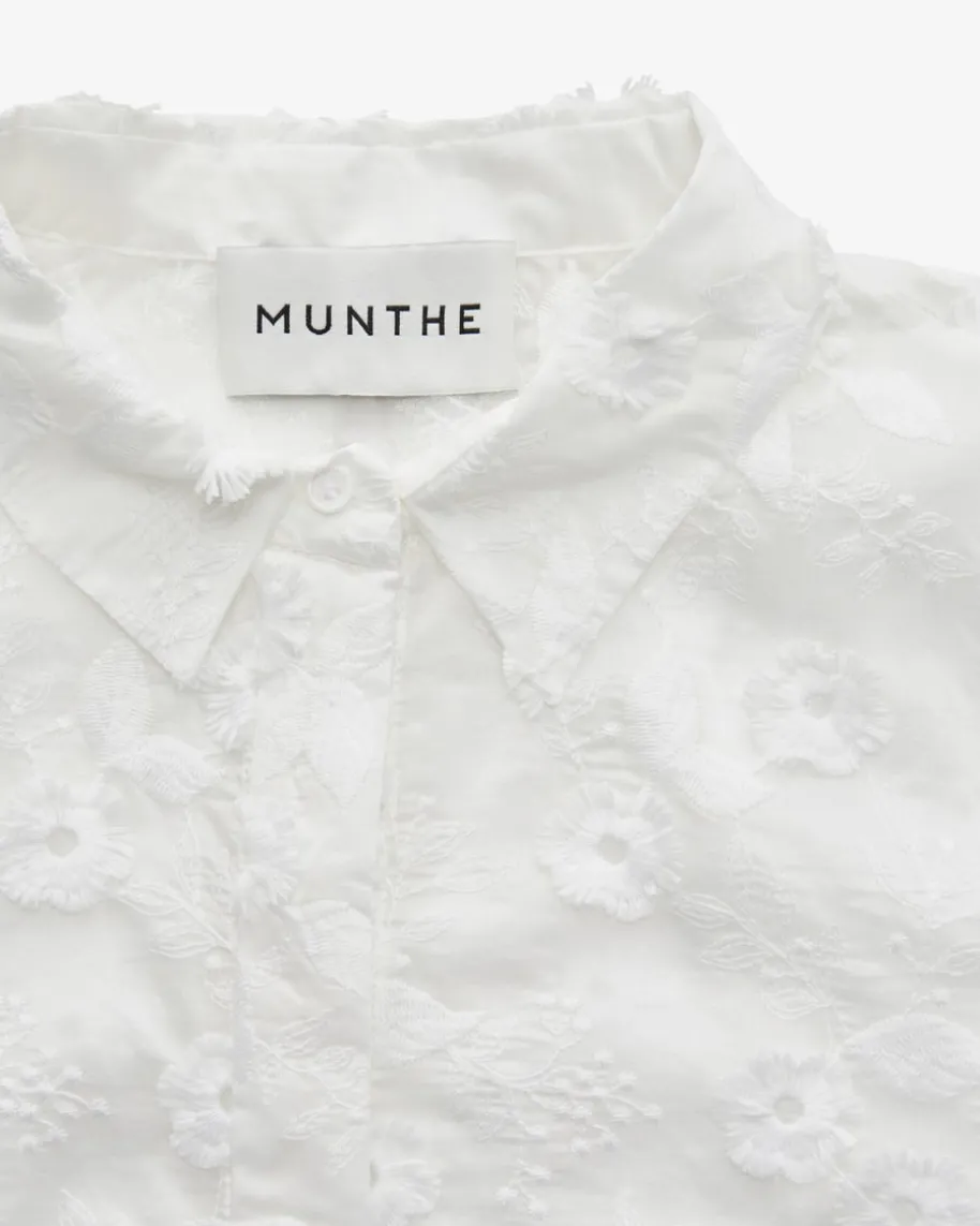 Pust Blusenshirt für Damen von Munthe in Weiß. Das transparente Modell überzeugtin klassischer Schnittform, während die florale 3-D Spitze das Gesamtbildharmonisch vollendet und einen modernen Begleiter für schicke Styles kreiert.