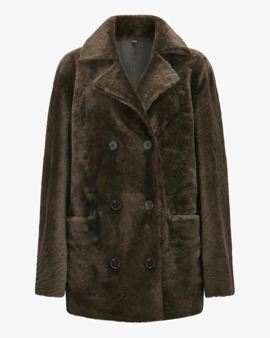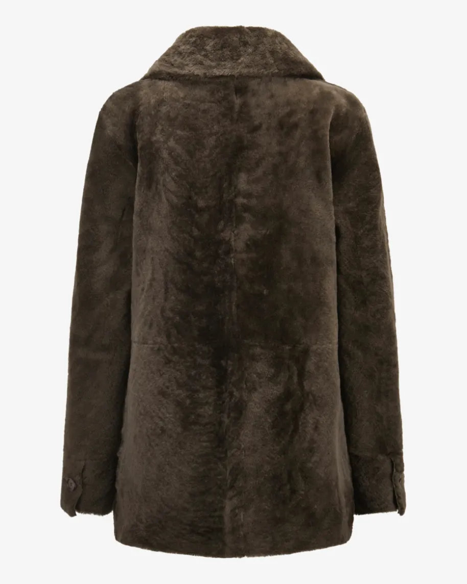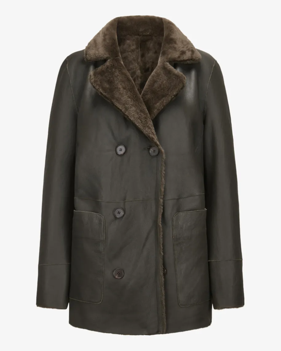 Rachel Schaffelljacke für Damen von Nove in Dunkeloliv. Die Marke ist bekanntfürhochwertige Essentials mit Fokus auf Klarheit, Funktionalität und femininerSilhouette. Das Modell zeichnet sich durch die Verwendung von hochwertigemLammleder aus, während die Fell-Innenseite mit seiner weichen und wärmendenEigenschaft optisch sowie haptisch punktet. Zugleich verleiht die zweireihigeAufmachung mit Reverskragen einen modischen Charakter.