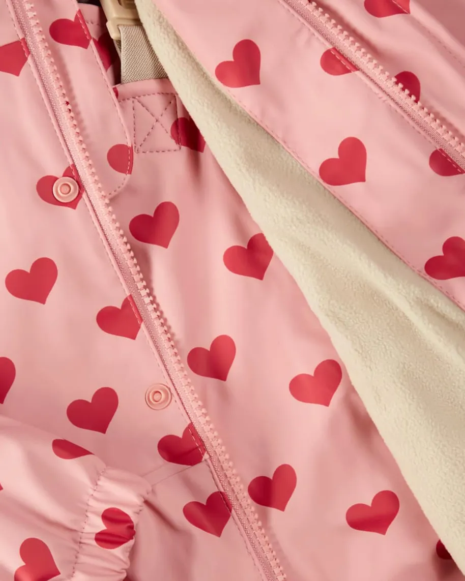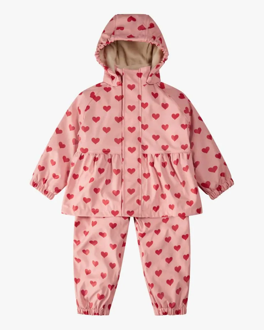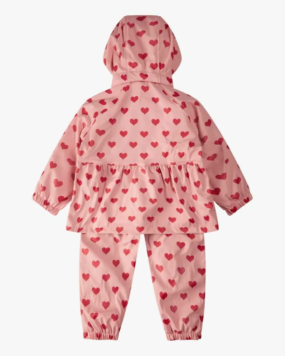 Rainy Palm Regenanzug für Babys von Konges Slojd in Rosa und Rot. Daszweiteilige Modell punktet mit niedlichem Herzmuster und ausgestellterSilhouette, während die wasserdichte Verarbeitung und die weiche Fleece-Innenseite für angenehmen Tragekomfort sorgen.