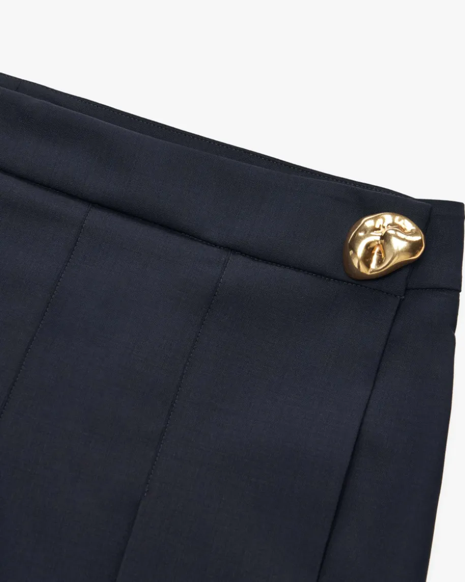 Rock für Damen von Fabiana Filippi in Navy. Das gerade geschnittene Modellpräsentiert sich im leichten Merinowoll-Mix mit origineller Faltenlegung undWickel-Technik, während das goldene Knopf-Detail einen edlen sowie femininenTouch verleiht.