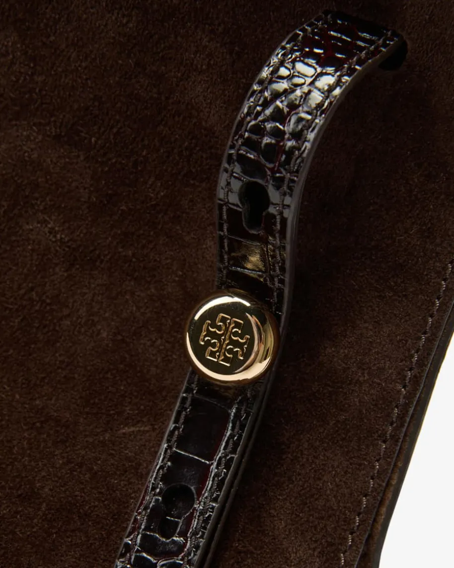 Romy Suede Bucket Tasche für Damen von Tory Burch in Schokolade. Das Modellpräsentiert sich dank weicher Veloursleder-Qualität in hochwertiger und zugleichzeitloser Aufmachung, während schmale Riemen mit goldfarbenen Logo-Details dasedle Gesamtbild mit besonderer Note vollenden.