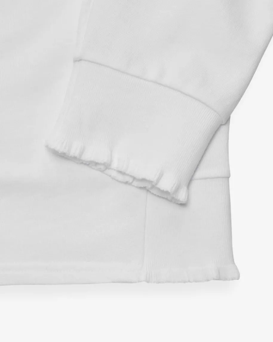 Rose Sweatshirt für Damen von Love Joy Victory in Weiß. Ein modischesWohlfühl-Piece! Dank der weichen Baumwoll-Qualität erhält das Modell eine weicheHaptik und einen modisch-legeren Look, während die Rippstrick-Details mitzarten Rüschen optische Highlights setzen.