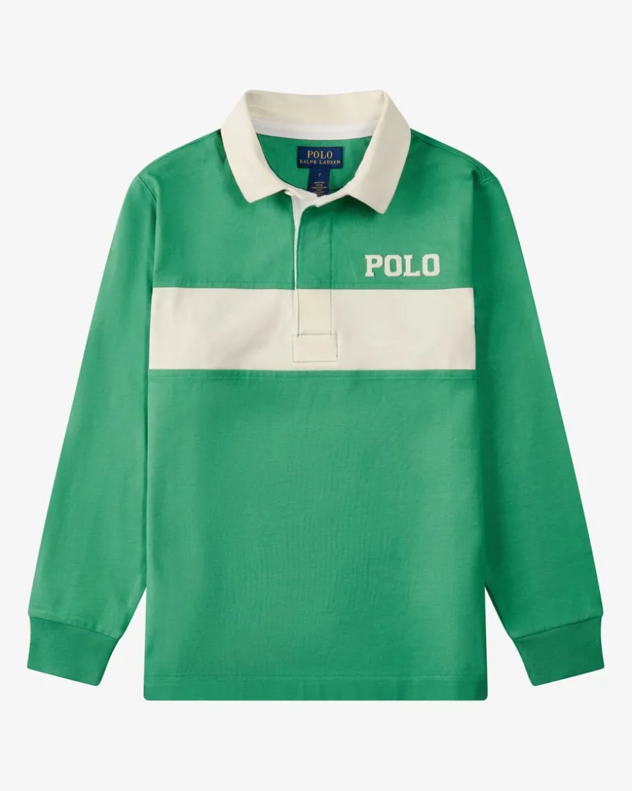 Rugbyshirt für Jungen von Polo Ralph Lauren in Grün und Weiß. Das Modellpräsentiert sich mit angenehmer Jersey-Qualität, während das sportive Design mitKontraststreifen einen modernen Casual-Begleiter kreiert. Der Logo-Aufnäherrundet das süße Gesamtbild gekonnt ab.