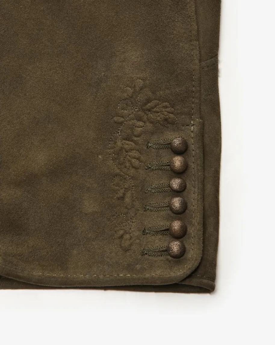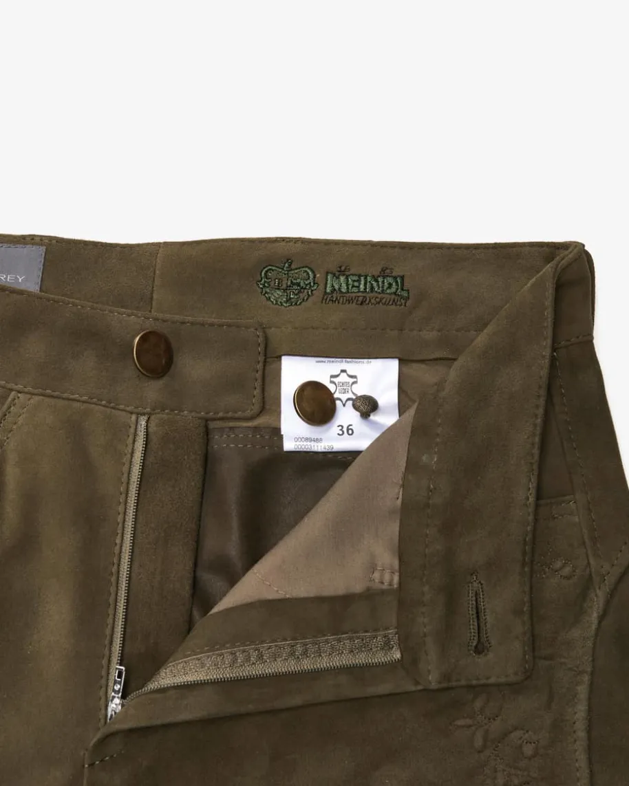 Ruth Trachten-Kniebundhose für Damen von Meindl in Dusty Green. DasTraditionsunternehmen Meindl steht seit Jahrzehnten für traditionelle Handarbeitund höchste Qualität. Auch dieses Kniebund Trachten-Modell aus hochwertigemZiegenleder überzeugt mit feinen Zierstickereien und goldfarbene Kugelknöpfen.