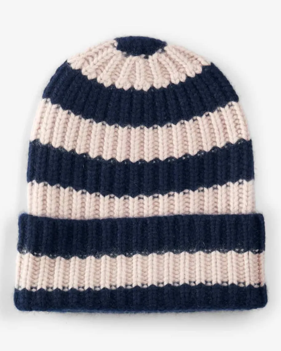 Sailor Cashmere-Mütze für Damen von Hurray Cashmere in Navy und Beige. DasModell aus hochwertiger Cashmere-Qualität avanciert durch sein grobes Strick-Design und softes Tragegefühl zum perfekten Begleiter für den Winter, währenddie modische Farbgebung den Look harmonisch vollendet.