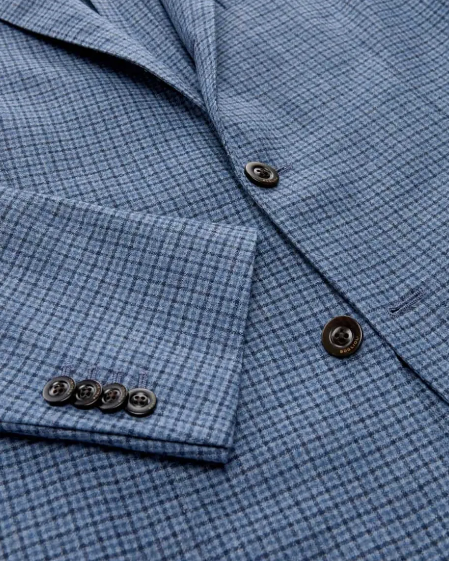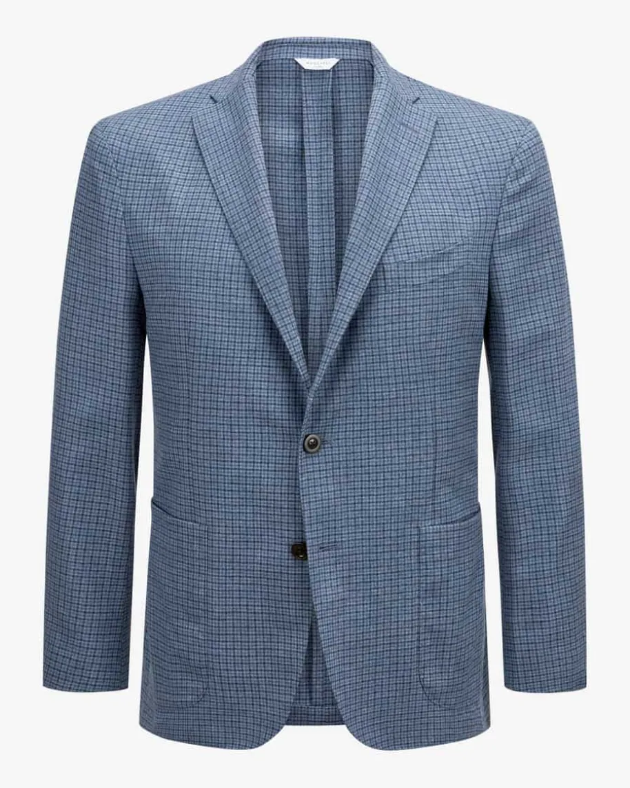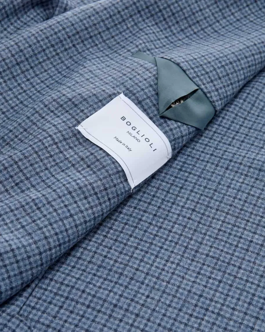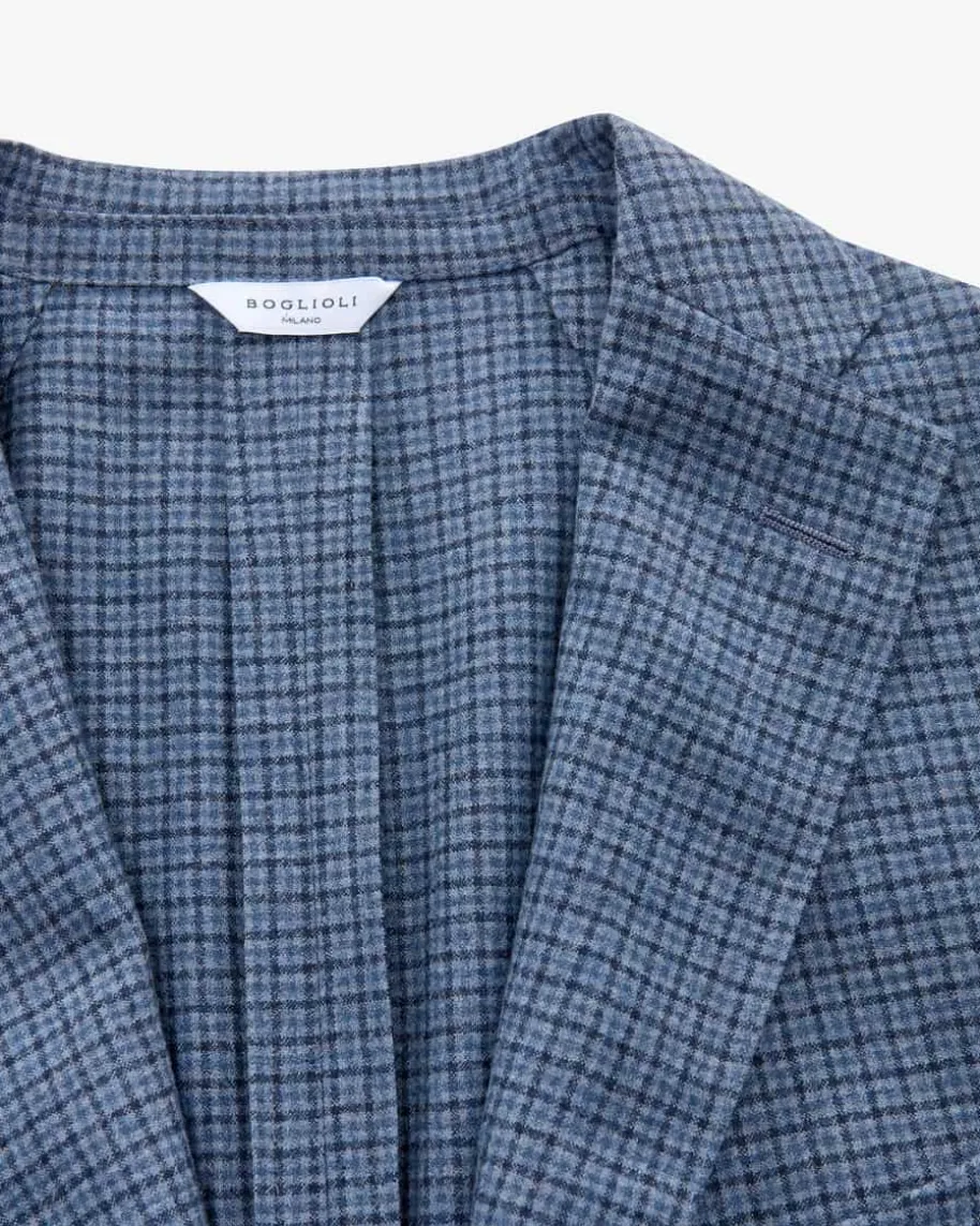 Sakko für Herren von Boglioli in Hellblau und Navy. Zeitlos und stilvollzugleich begeistert das ungefütterte Modell aus hochwertiger Woll-Verarbeitungmit softer Flanell-Haptik und Karomuster, während die legendäre K.Jacket-Reihefür eine optimale Passform mit leichtem Tragegefühl und legerem Charakter steht.