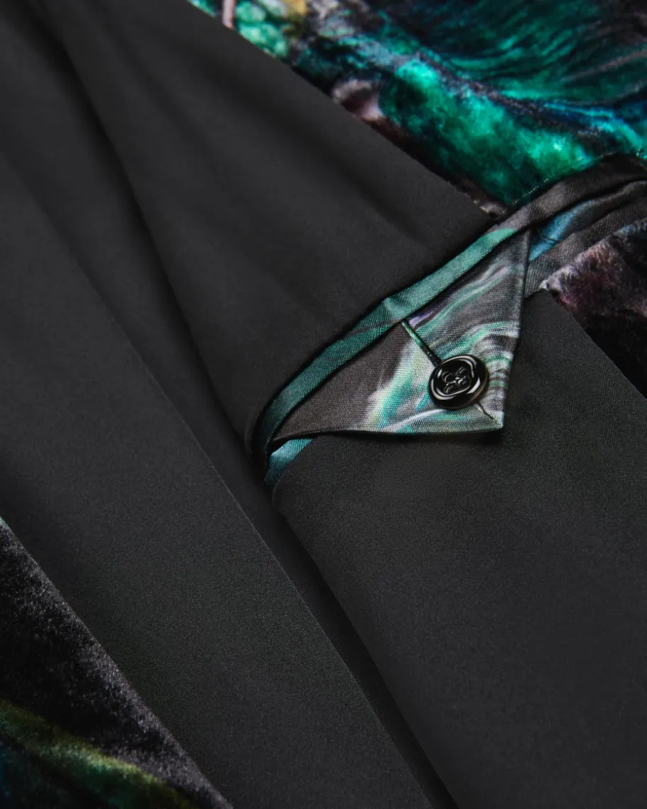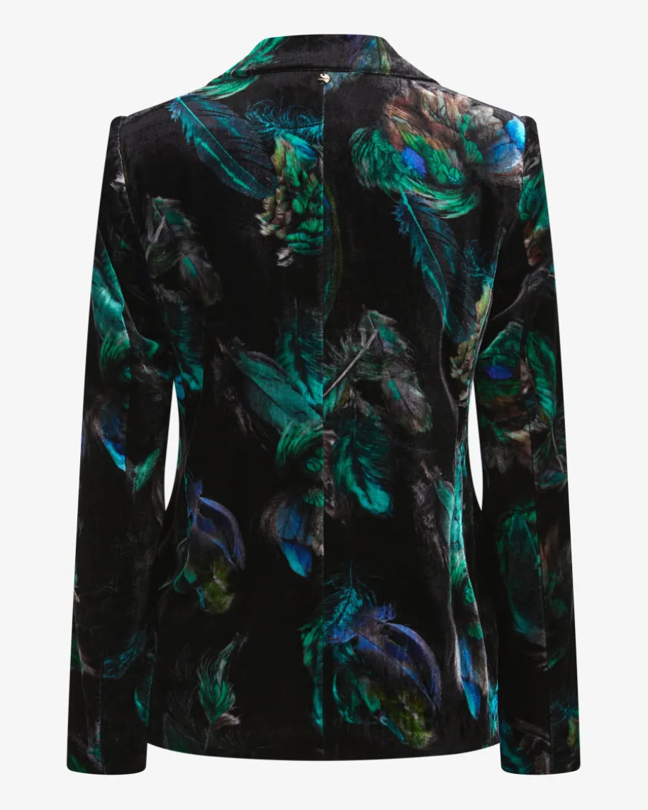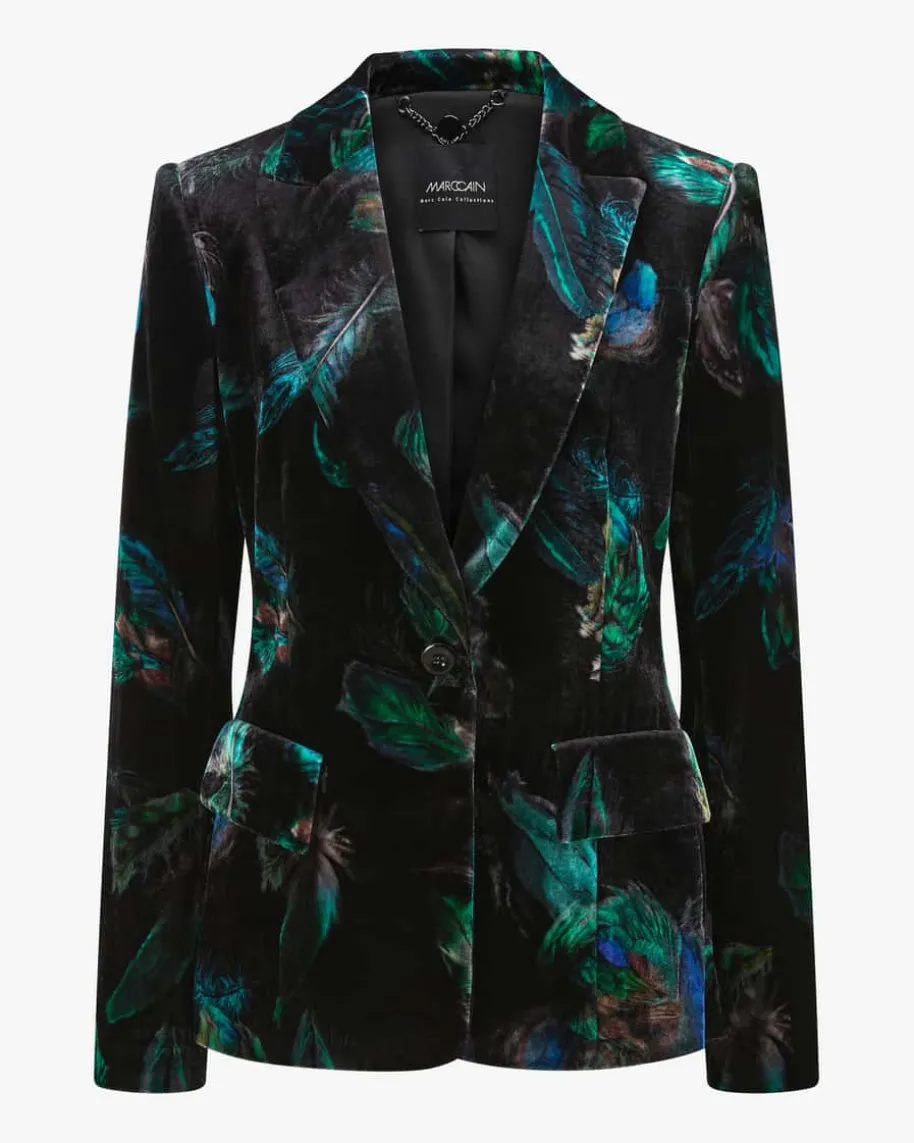 Samtblazer für Damen von Marc Cain in Schwarz, Grün und Blau. KombistarkeDesigns mit hohem Qualitätsanspruch – bekannt für Prints & Strick. Auch diesesModell in schlichter Schnittform überzeugt in weicher Samt-Aufmachung, währenddas Feder-Design den Gesamtlook feminin vollendet.
