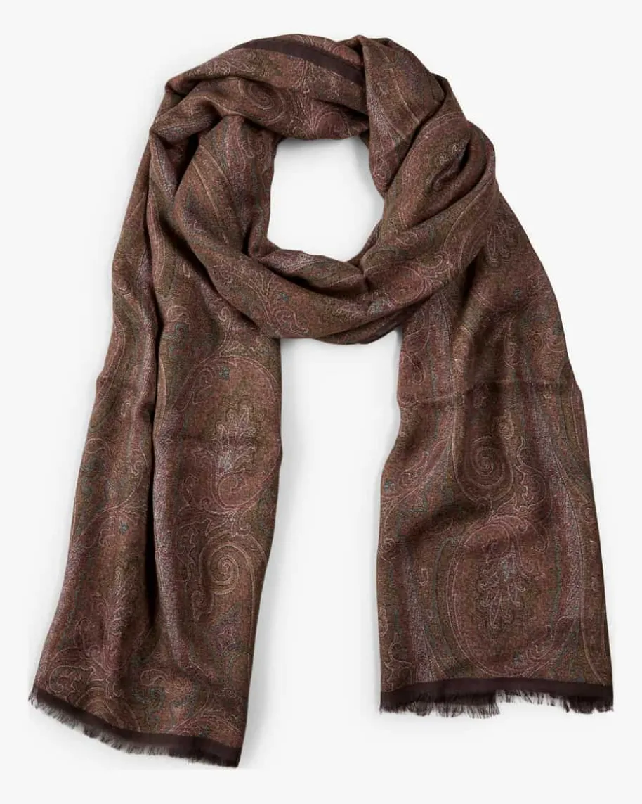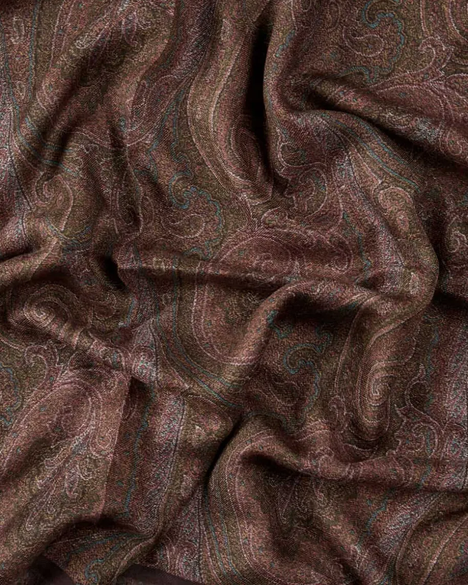Schal für Herren von Etro in Aubergine, Moosgrün und Himbeere. Gefertigt aushauchdünner Material-Qualität, avanciert der Schal zum edlen Accessoire, dasdurch seinen labeltypischen Arnica-Print ein ikonisches Flair ausstrahlt.
