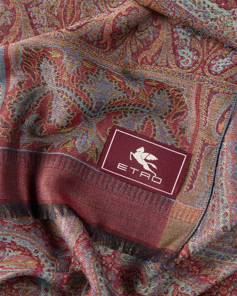 Schal für Herren von Etro in Bordeaux, Grün und Blau. Gefertigt aushochwertigem, fein strukturiertem Woll-Seide-Mix avanciert der Schal zum edlenAccessoire, das durch seinen labeltypischen Paisley-Print ein ikonisches Flairausstrahlt.