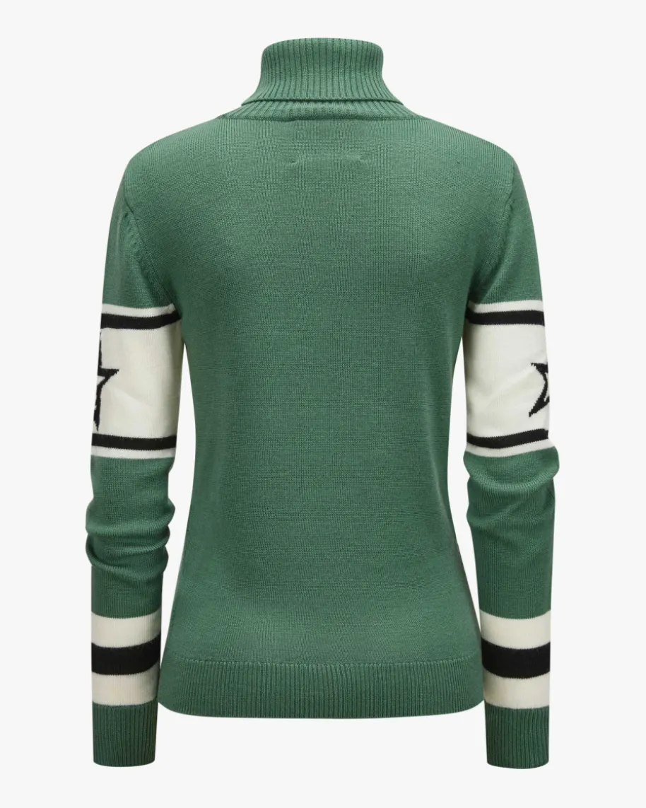 Schild Rollkragenpullover für Damen von Perfect Moment in Hellgrün und Off-White. Fürgeschmackvolle Après-Ski-Looks – Während die hochwertige Merinowolle für einenbesonders weichen Griff sorgt, kreiert das zeitlose Design mit kontrastierenderIntarsie und Streifen-Details einen sportiven Winter-Favoriten.