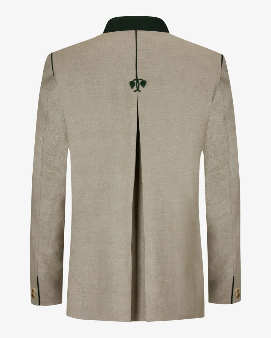 Trachten-Janker für Herren von Sandberg in Grün und Beige.Der exklusiv fürLODENFREY entworfene Janker aus hochwertigem Baumwoll-Leinen-Mix wird durchdunkelgrüne Paspeln an den drei Taschen, der Verschluss-Leiste und demStehkragen gekonnt in Szene gesetzt. Hornknöpfe aus edlemHirschhorn verleiheneine rustikale Note, während eine dezente Schulterwattierungsowie einerückseitige Kellerfalte die klassische Silhouette mit zweiInnentaschen undchangierendem Futter vollenden.