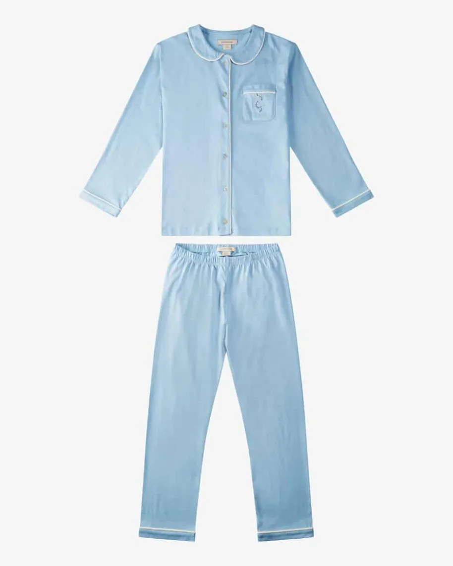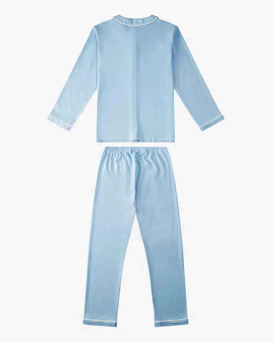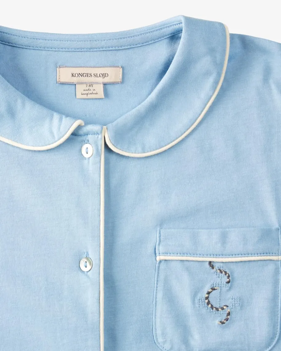 Schlafanzug für Jungen von Konges Slojd in Hellblau. Das Modell besticht dankder weichen Bio-Baumwolle mit angenehmen Tragemomenten, während labeltypischeElemente sowie kontrastierende Paspeln ein modisches Gesamtbild kreieren.
